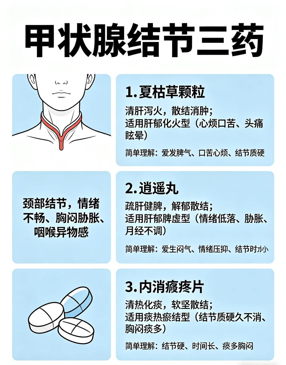 结节:肝火夏枯草,肝郁逍遥丸,痰瘀内消瘰疬。