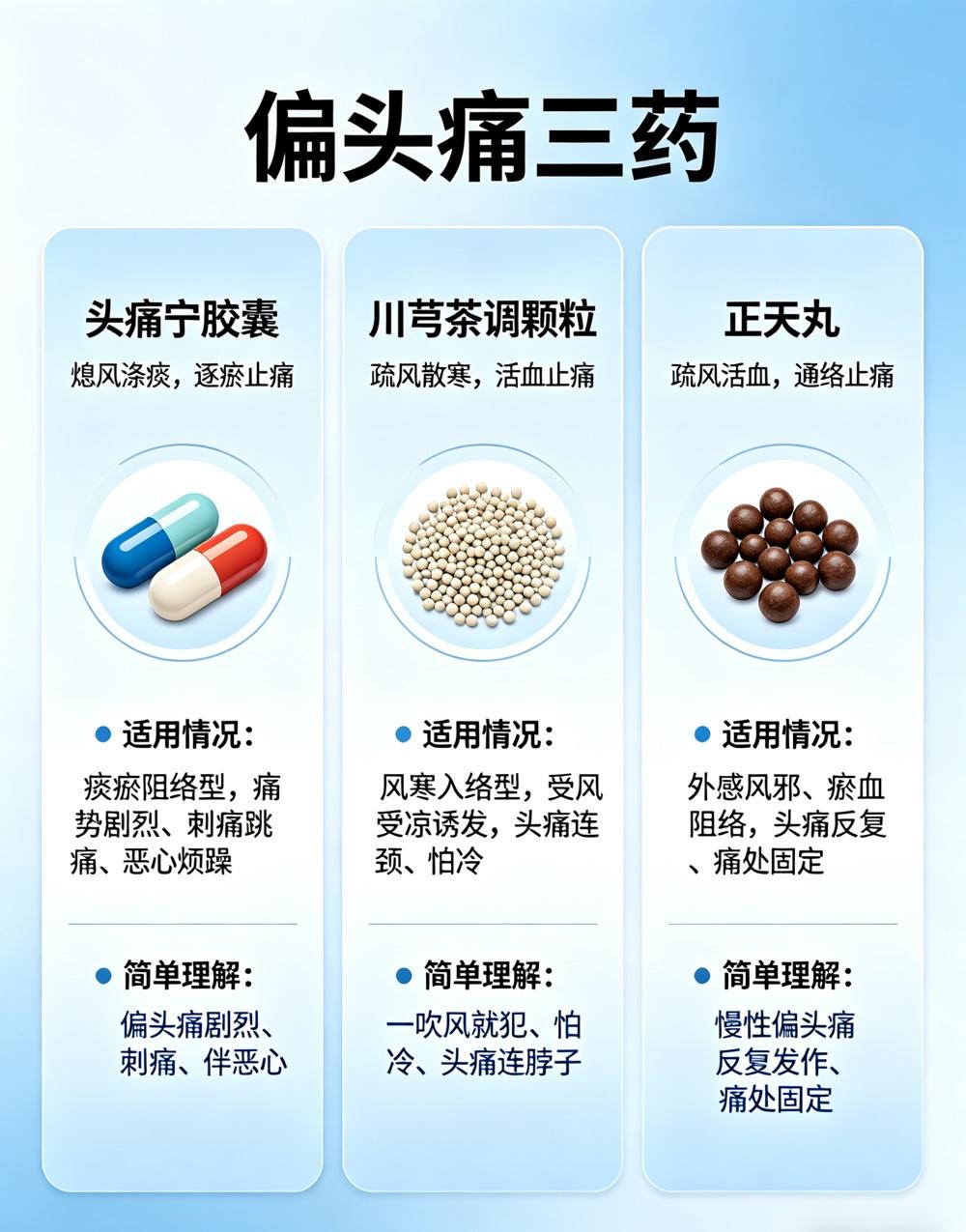 偏头痛:剧痛头痛宁,风寒川芎茶调,慢性正天丸。