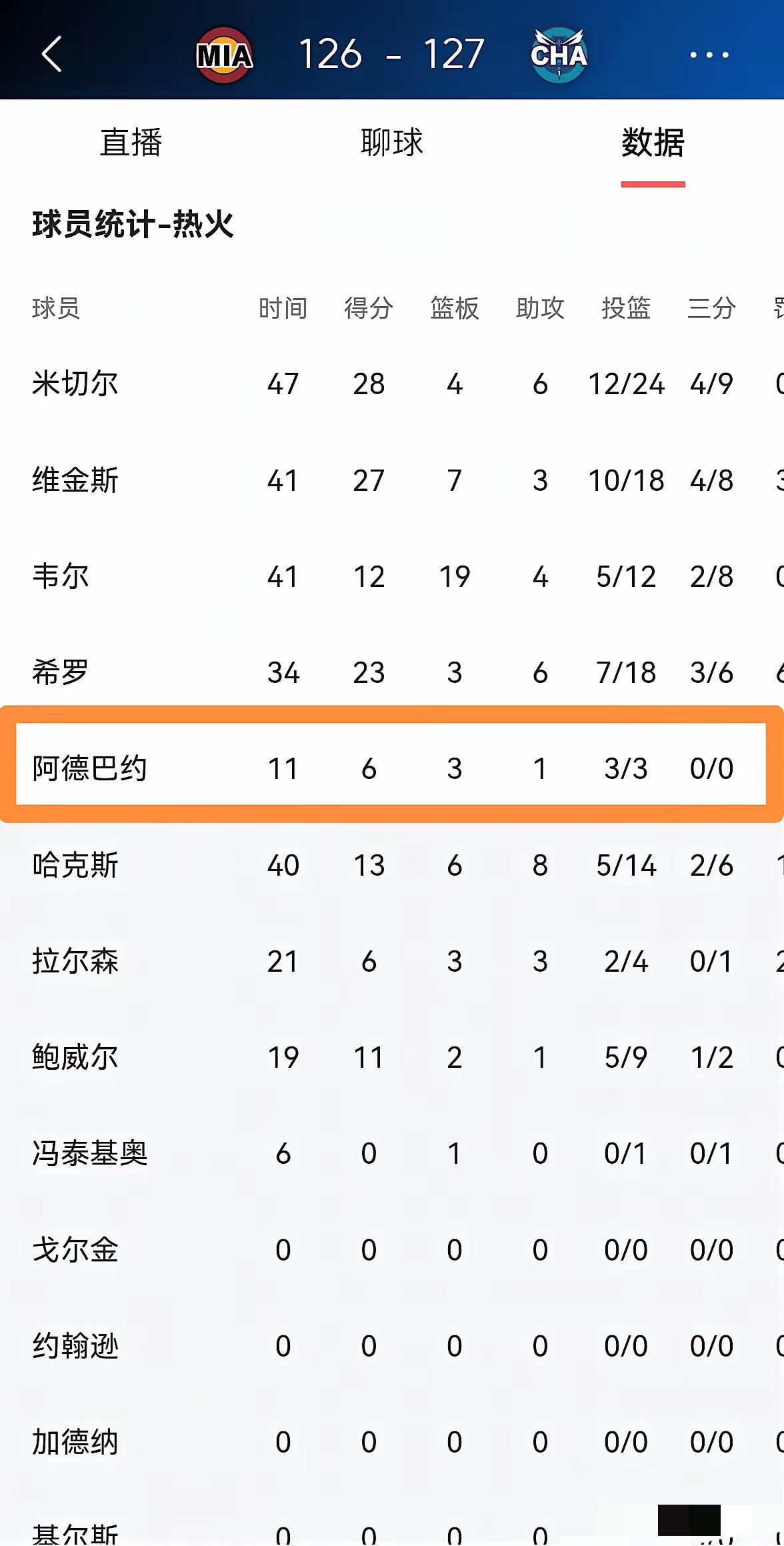 热火83分先生阿德巴约真是太可惜了!在今天热火客场以126:127输给黄蜂的比赛中,尽管阿德巴约的状态非常的出色,然而让人感到可惜的是,阿德巴约在仅仅出战了11分钟后就因伤提前退赛。