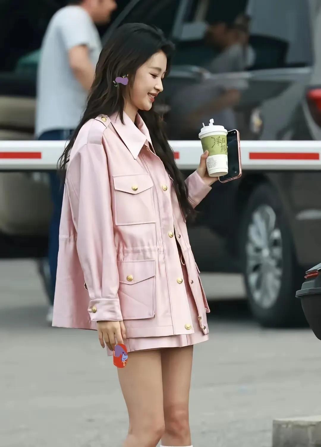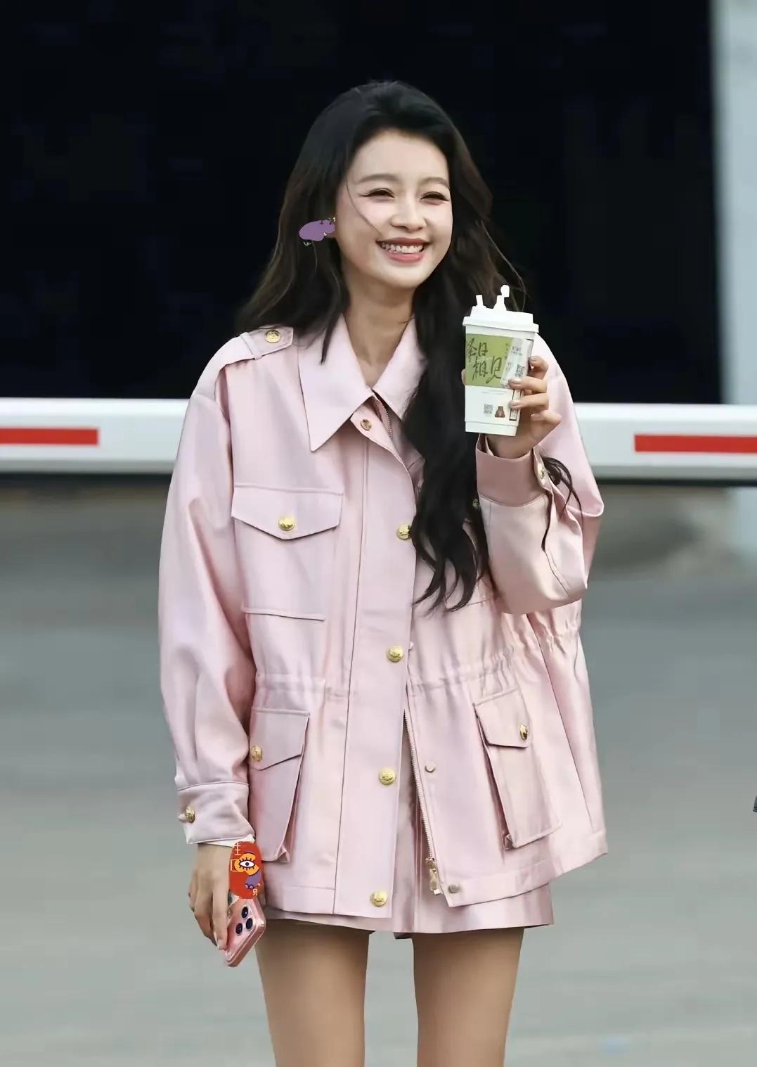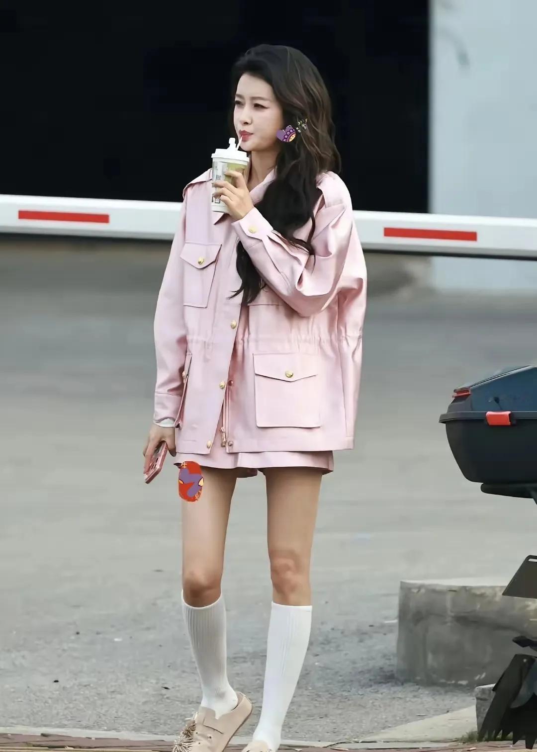 谁能拒绝甜妹孙怡! 一身粉色工装套装,温柔又飒爽 白长袜+勃肯鞋,松弛感拉满 笑
