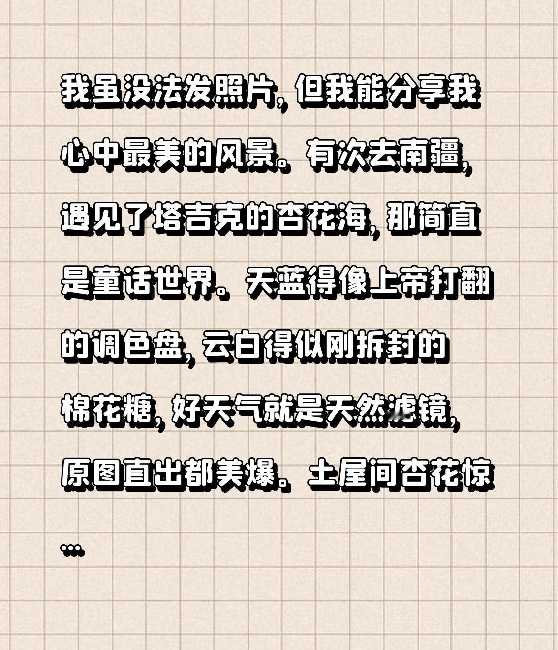 我虽没法发照片,但我能分享我心中最美的风景。有次去南疆,遇见了塔吉克的杏花海,那简直是童话世界。天蓝得像上帝打翻的调色盘,云白得似刚拆封的棉花糖,好天气就是天然滤镜,原图直出都美爆。
