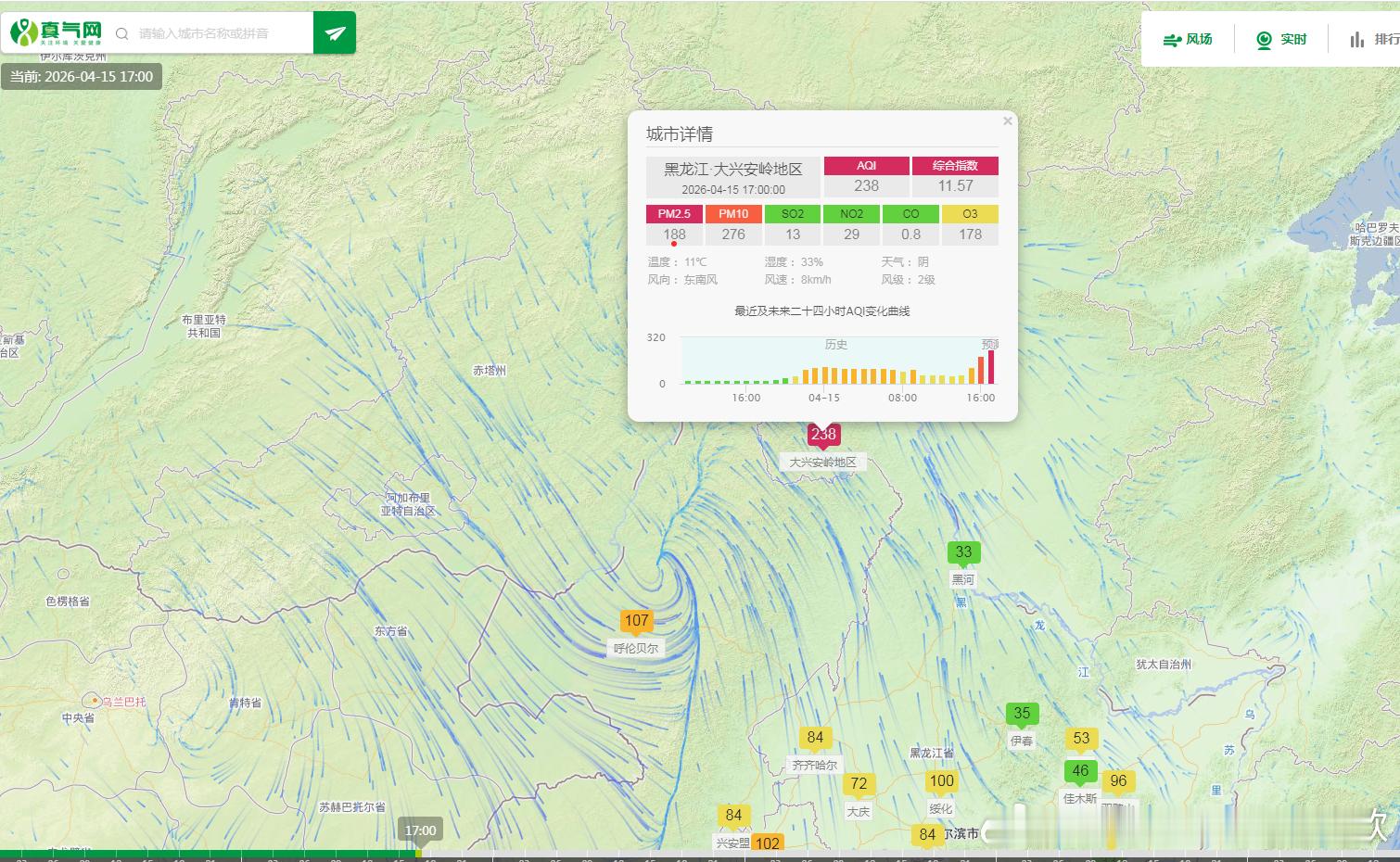 【雾 霾 沙尘】今天17时空气质量,甘肃酒泉出现沙尘污染。黑龙江大兴安岭首要污染物为PM2.5,这个应该是南风输送上来的,上游应该是烧东西了。今晚到明天上午,贵州、重庆、湖南、湖北、河南、安徽、江西、浙江,福建可能出现零散的大雾。