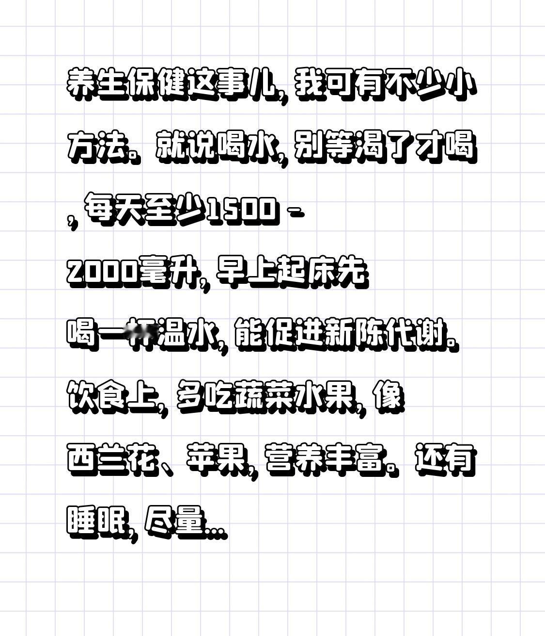 养生保健这事儿,我可有不少小方法。就说喝水,别等渴了才喝,每天至少1500 - 2000毫升,早上起床先喝一杯温水,能促进新陈代谢。饮食上,多吃蔬菜水果,像西兰花、苹果,营养丰富。还有睡眠,尽量晚上11点前睡,保证7 - 8小时的高质量睡眠,第二天精神倍儿棒。另外,每天花10 - 15分钟做简单的拉伸运动,活动下筋骨,能缓解身体疲劳。这些方法简单又实用,坚持下去,身体会给你惊喜。