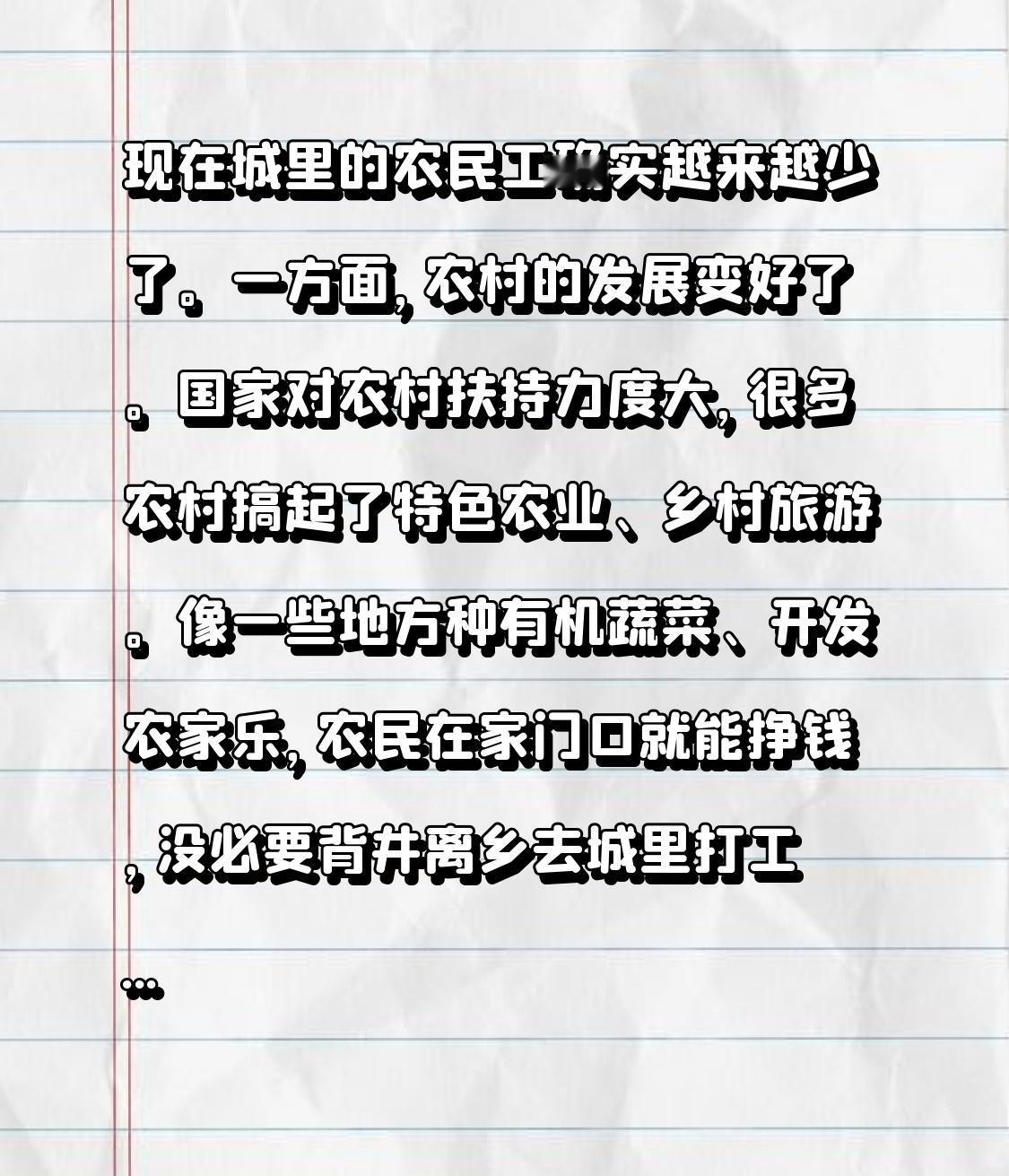 现在城里的农民工确实越来越少了。一方面,农村的发展变好了。国家对农村扶持力度大,很多农村搞起了特色农业、乡村旅游。像一些地方种有机蔬菜、开发农家乐,农民在家门口就能挣钱,没必要背井离乡去城里打工。