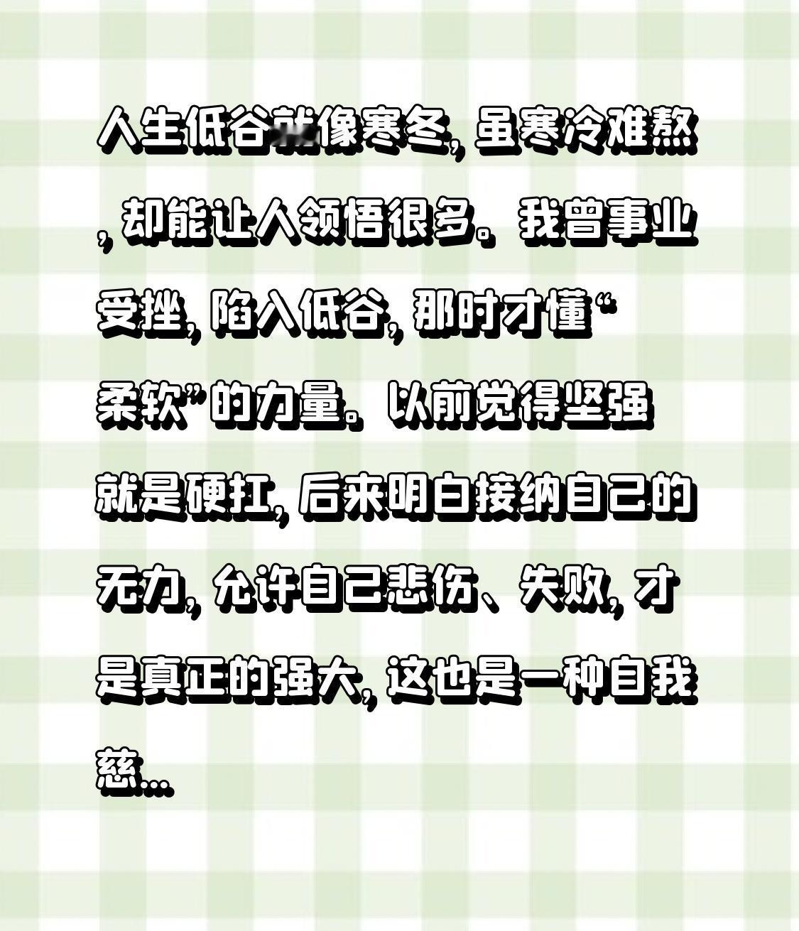 人生低谷就像寒冬,虽寒冷难熬,却能让人领悟很多。我曾事业受挫,陷入低谷,那时才懂“柔软”的力量。以前觉得坚强就是硬扛,后来明白接纳自己的无力,允许自己悲伤、失败,才是真正的强大,这也是一种自我慈悲。