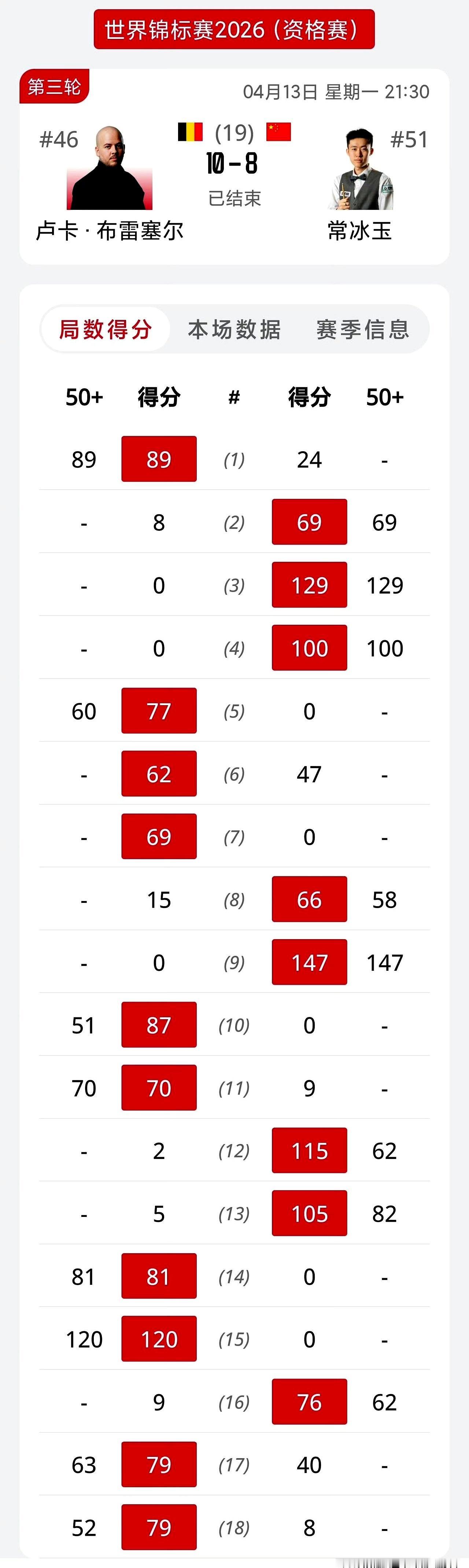 第17局是关键。常冰玉本来有机会清彩球逆转,结果在打黄球时走位失误。布雷切尔抓住机会连赢两局,常冰玉8比10遗憾出局。