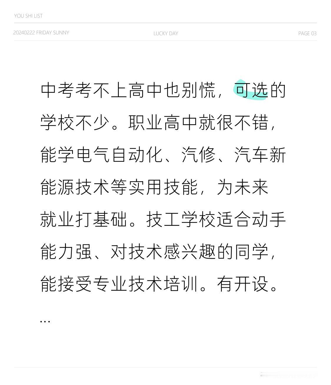 中考考不上高中也别慌,可选的学校不少。职业高中就很不错,能学电气自动化、汽修、汽车新能源技术等实用技能,为未来就业打基础。