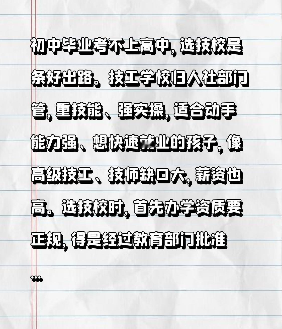 初中毕业考不上高中,选技校是条好出路。技工学校归人社部门管,重技能、强实操,适合动手能力强、想快速就业的孩子,像高级技工、技师缺口大,薪资也高。