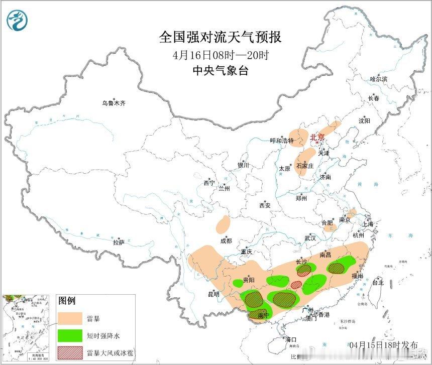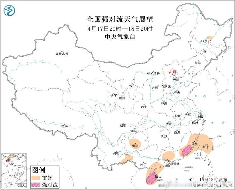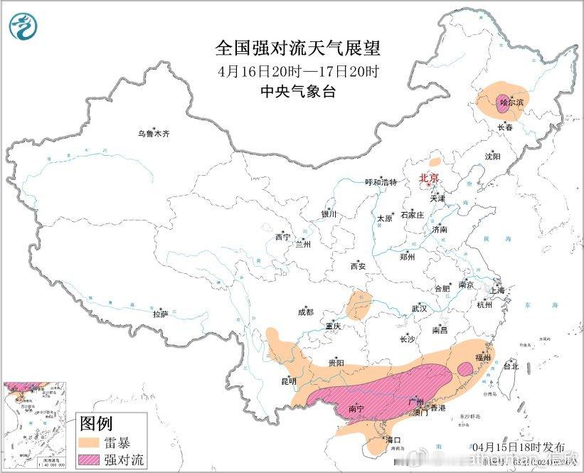 预计4月16日20时至17日20时,黑龙江西南部、吉林西部、江西南部、福建东南部、云南东南部、广西中南部、广东北部和中西部等地的部分地区将有强对流天气。预计4月17日20时至18日20时,福建东南部、广东东部和西南部沿海、海南岛等地的部分地区将有强对流天气。