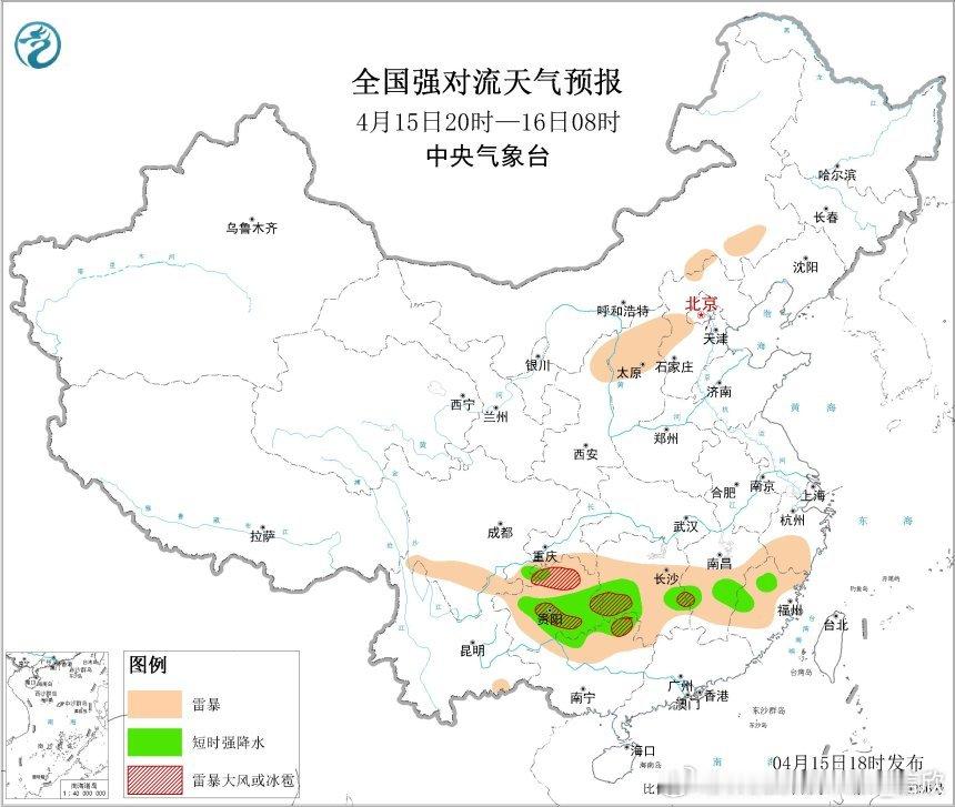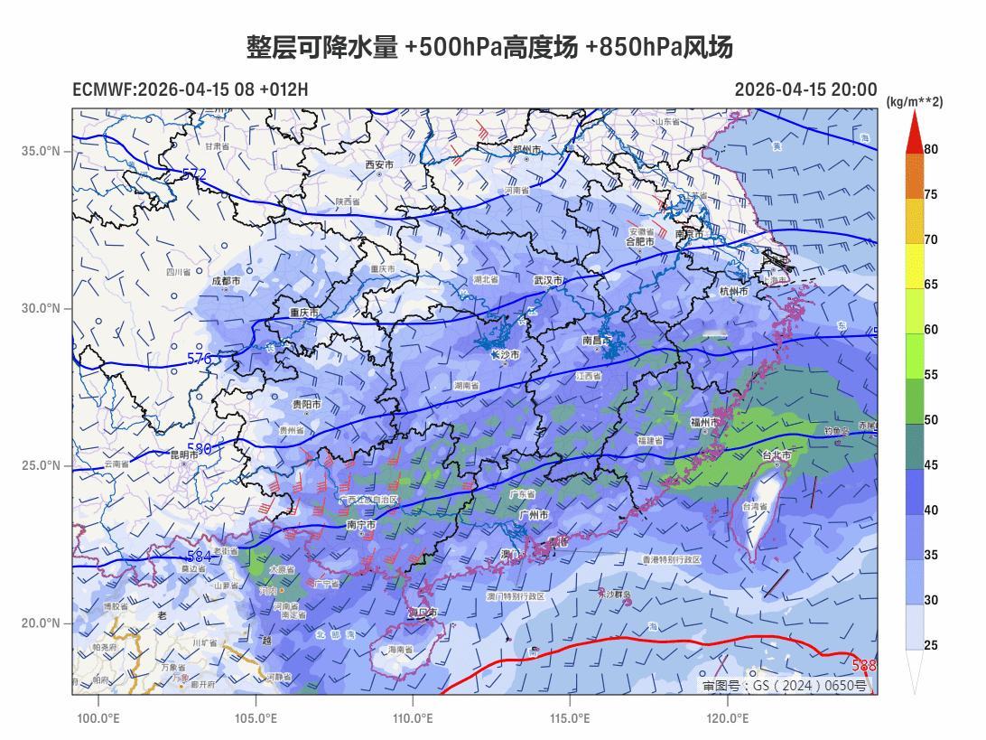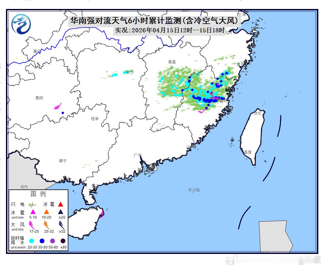 预计4月15日20时至16日20时,贵州中南部、广西中北部和西部、广东北部和西部、湖南中南部、江西中南部、福建西北部等地的部分地区将有短时强降水天气,小时雨量20-40毫米,局地可达50毫米以上;另外,贵州中东部、广西中北部和西部、湖南中南部、江西中部、福建西北部等地的局地将有雷暴大风或冰雹天气。