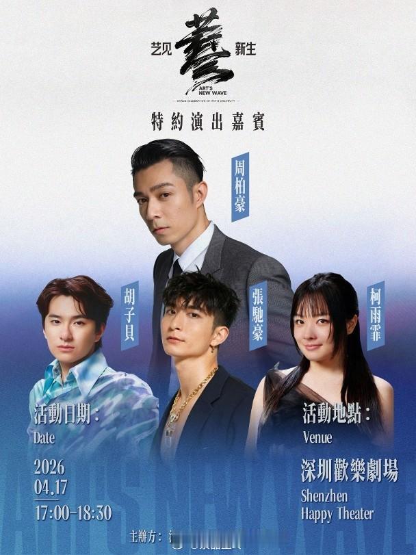 「男神」周柏豪偕參加無綫唱歌比賽《聲秀》的柯雨霏(Ophelia)、張馳豪和胡子貝出席深圳舉行的《國潮·藝見新生》活動。日前大會特別隆重其事舉行記者會公布詳情,並邀請了Ophelia、陳慧敏、Cassette卡式帶樂團、唐浩嘉及資深音樂人方樹樑等出席,Ophelia會聯同周柏豪、張馳豪和胡子貝為整個活動打頭陣,她表示非常期待演出:「因為係我第一次『霏出香港』表演,而且是喺深圳呢個大舞台演出,我除咗會唱自己歌《直覺型美學》之外,亦會唱啲藝術性嘅歌曲。」