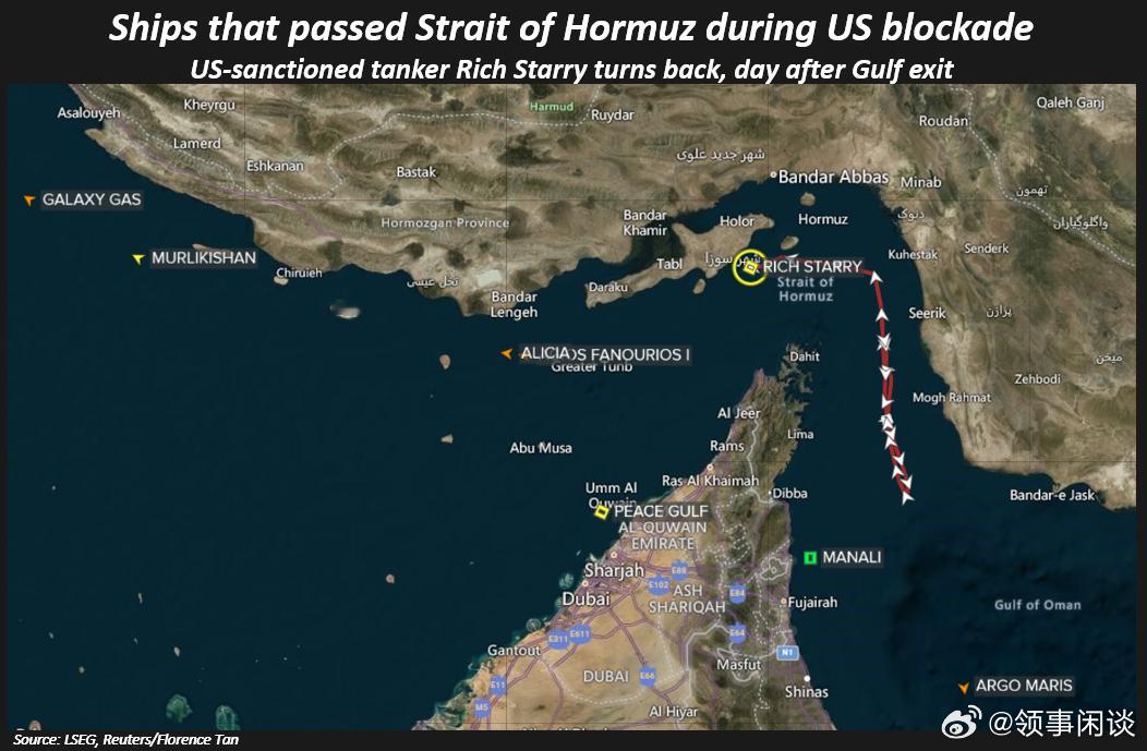 (路透社)——航运数据显示,受美国制裁的油轮“Rich Starry”号在周三离开波斯湾后,又返回霍尔木兹海峡,未能突破美国对停靠伊朗港口船只的封锁。