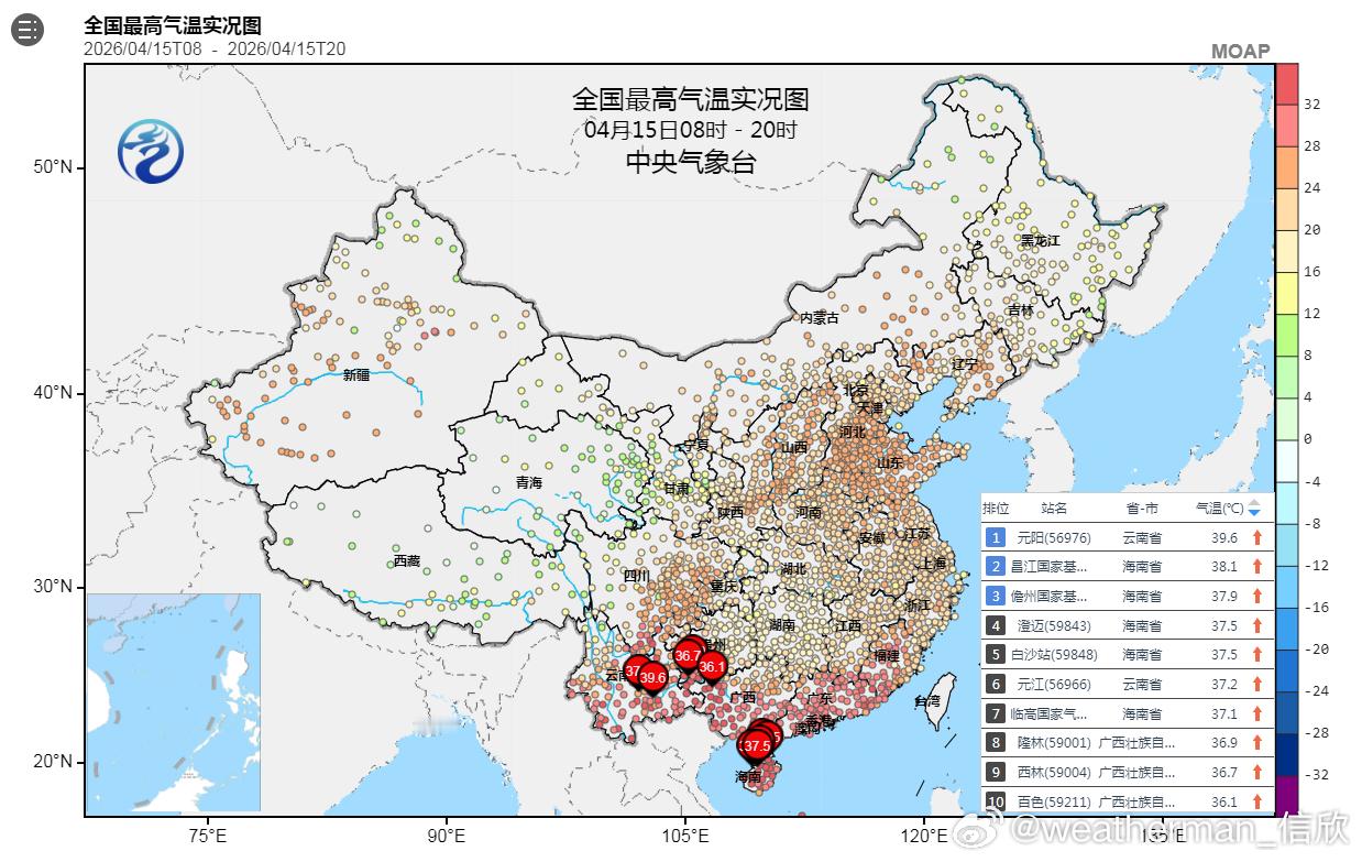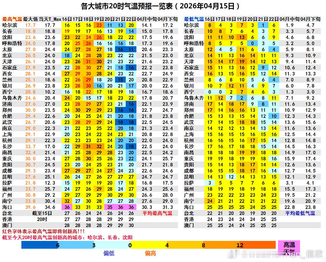 【气温】关注三个方面:海南高温,气温创新高,气温波动。今天海南高温减弱,海口34.6℃退出高温,当地4月最长连续高温纪录定格在10天。澄迈今天最高37.5℃,连续40℃酷热也告一段落。明天海口不排除还有高温,17-19日无高温。20日以后高温可能再返场。