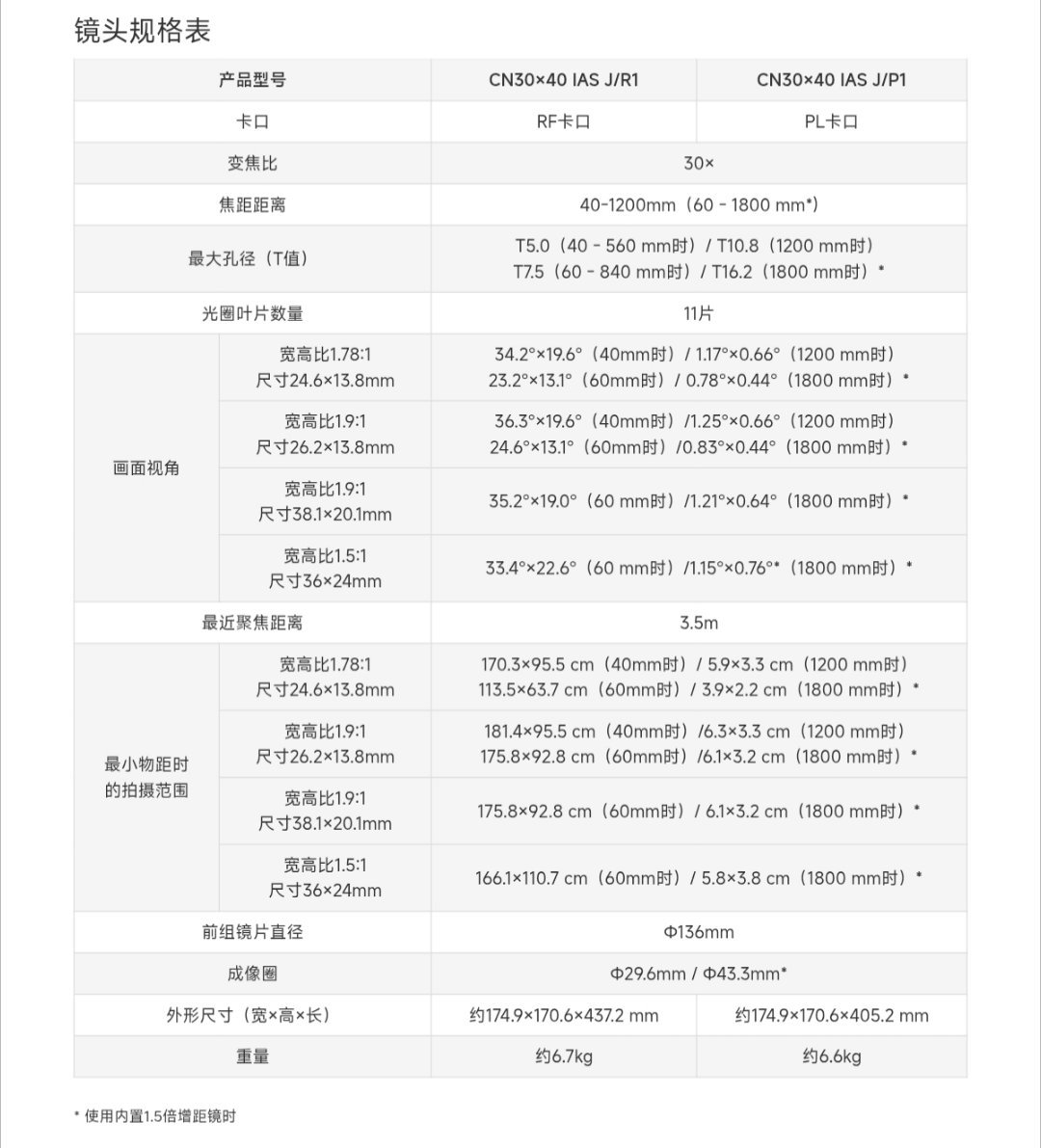 佳能发布40-1200mm T5.0-10.8镜头(CN30×40 IAS),内置1.5倍增距镜