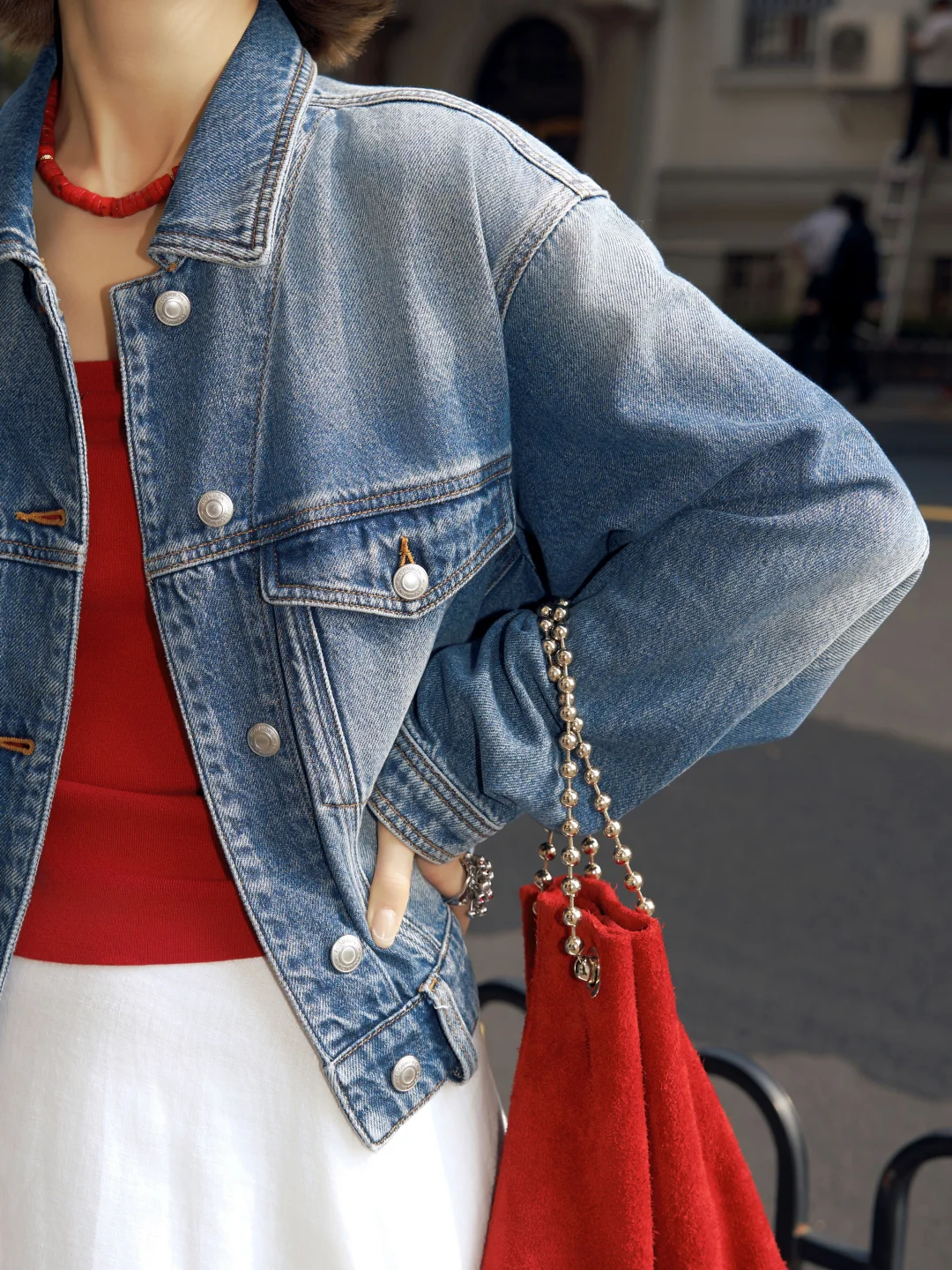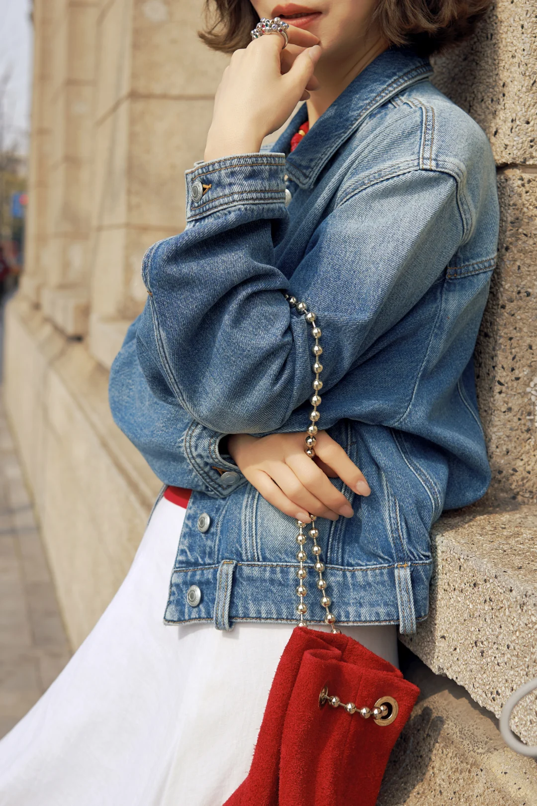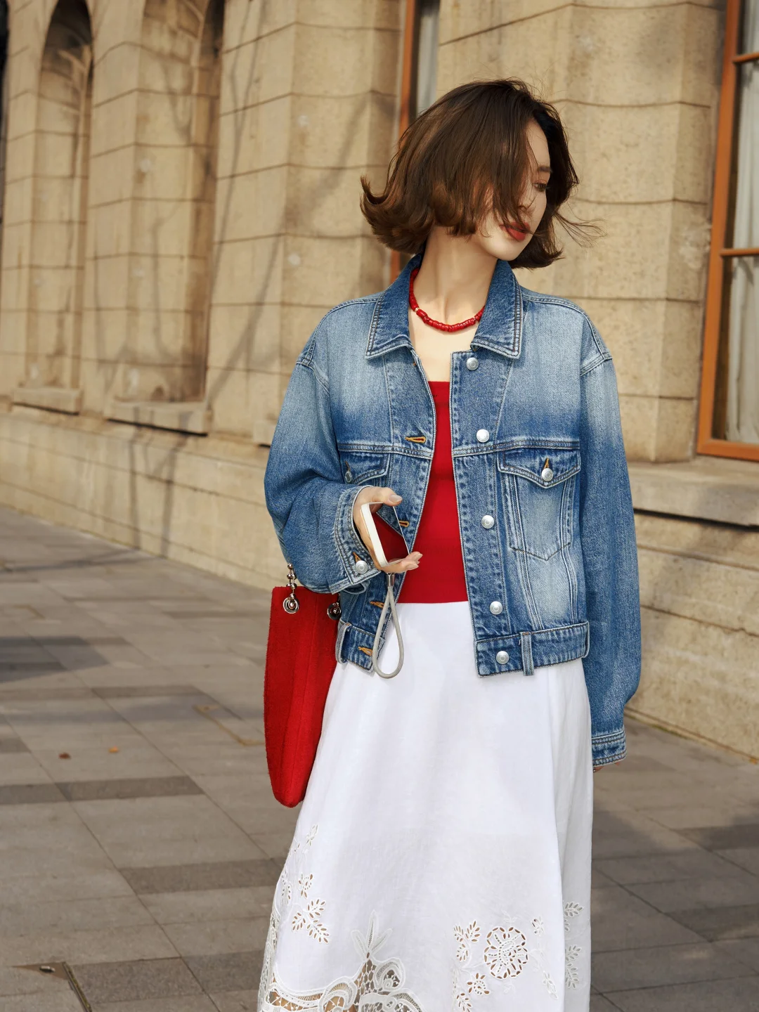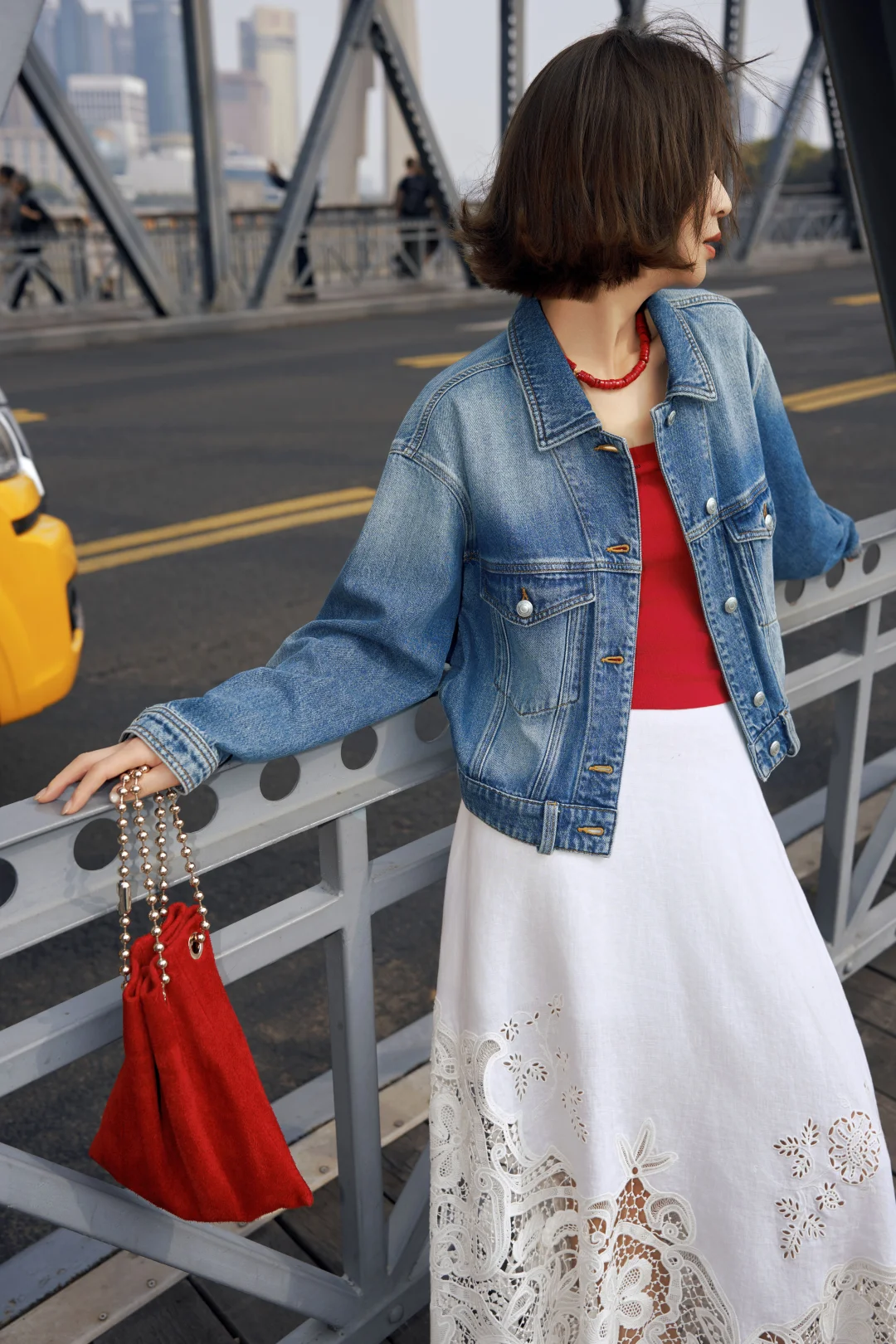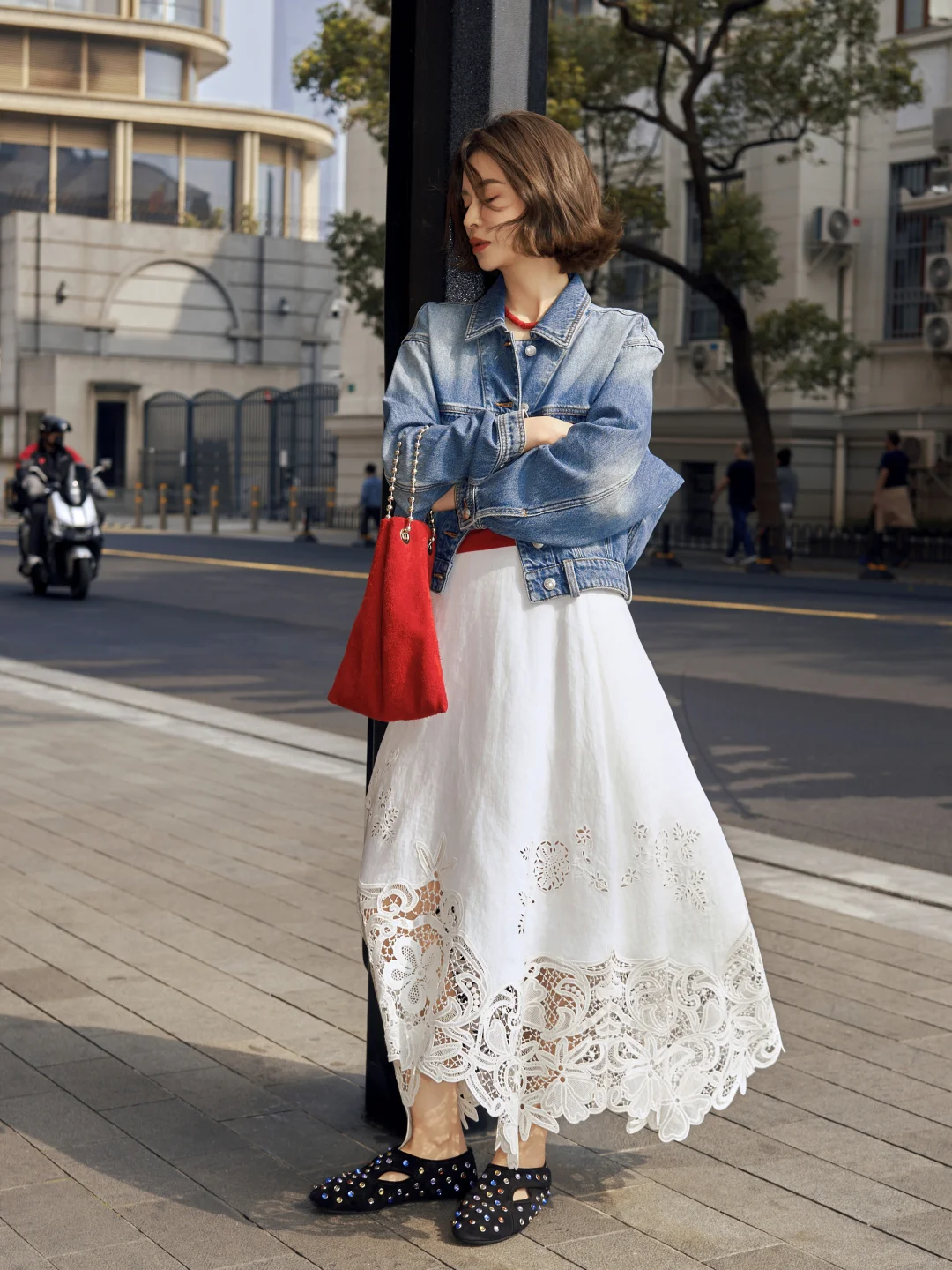 牛仔外套搭白色蕾丝半裙,松弛又高级的氛围感拉满~