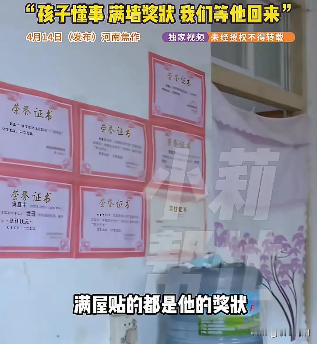 孩子从小就懂事,他知道家里难,别人家孩子买零食,他从不买。村支书说孩子学习非常好,是全年级前三名。墙上贴满了奖状,数学物理单科状元好几张。