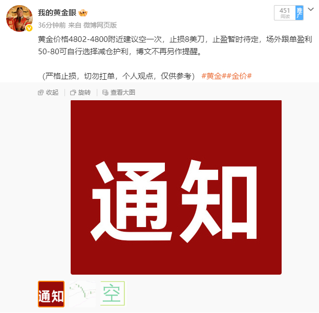 晚间布局的4802空单已严格按照止损原则在4811离场,亏损80点。十三连胜终结。我承认自己这次判断有误,进场还是太急了,节奏没踩对,调整好心态还是等行情回踩再慢慢吃回来吧。但交易就是这样,有赚有亏,重要的是永远把风险控制在自己手里。实盘所有学员已同步止损离场,没有任何人扛单。黄金金价