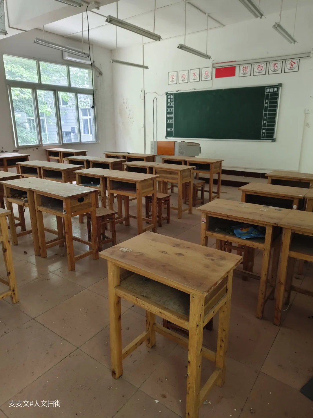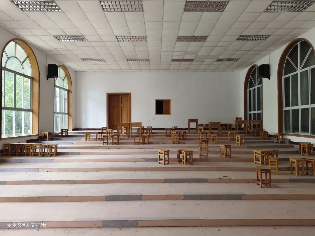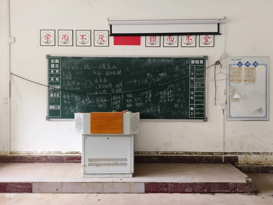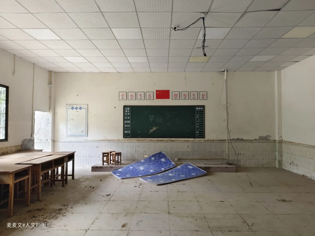 要抵达校园,得先穿过一条幽深的石砌隧道,隧道上方写着慧泉门,仿佛穿越回千禧年的校园时光。如今这里只剩满目荒芜:黑板上还留着“高考后我想”的未竟字迹,“学而不厌,锲而不舍”的标语仍悬在墙,老式木质课桌椅蒙尘,宿舍高低床空荡,曾经人声鼎沸的阶梯教室、篮球场,只剩风雨侵蚀的痕迹。