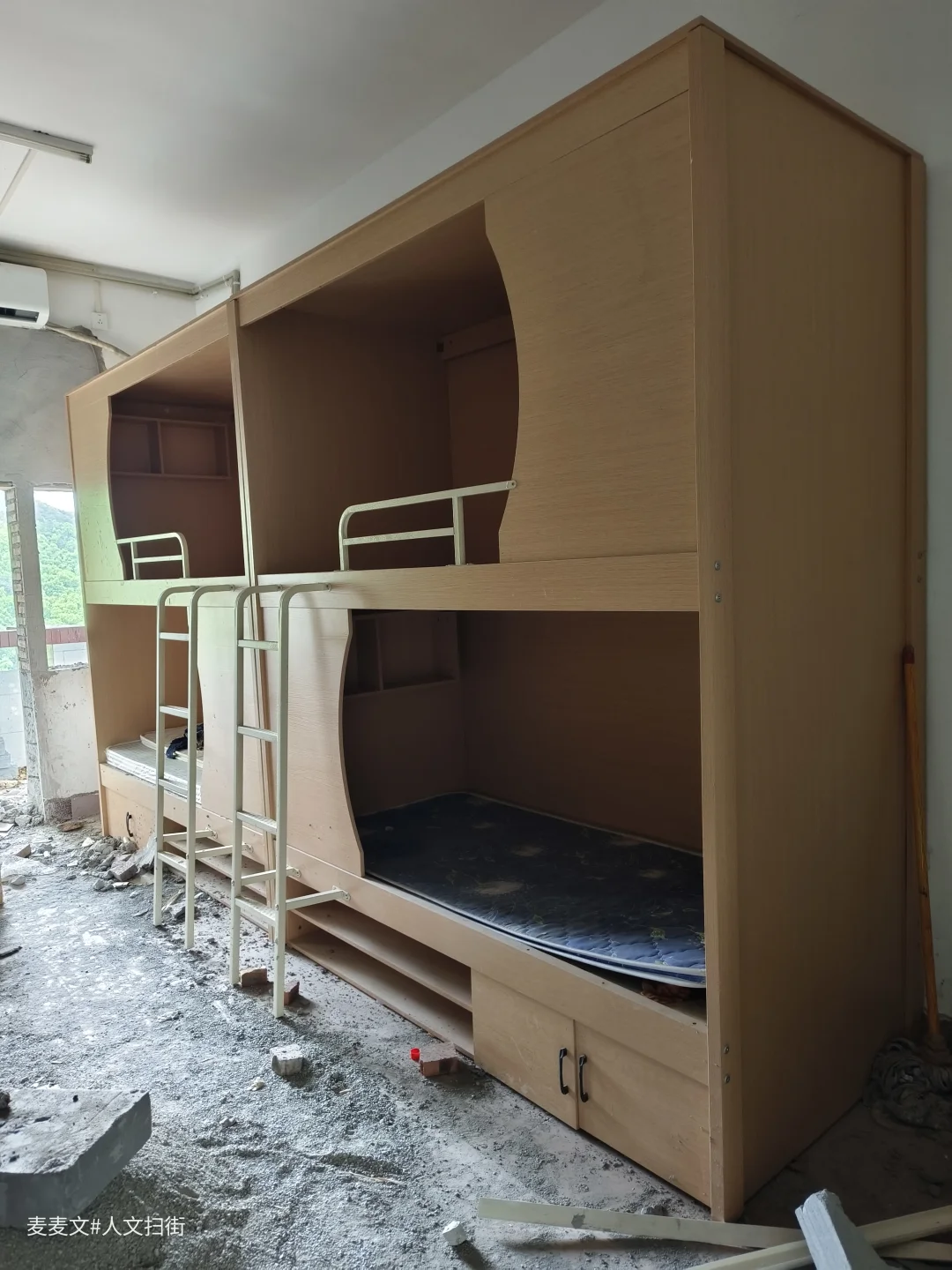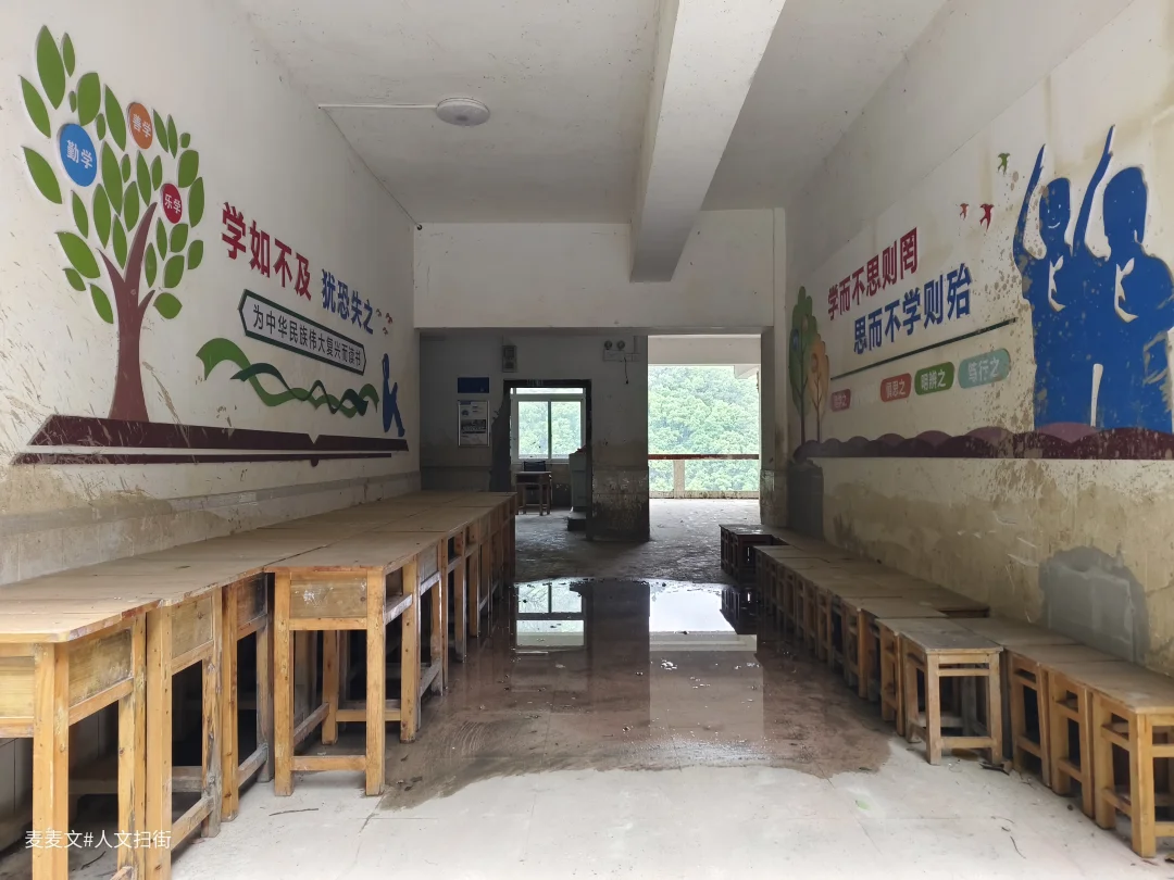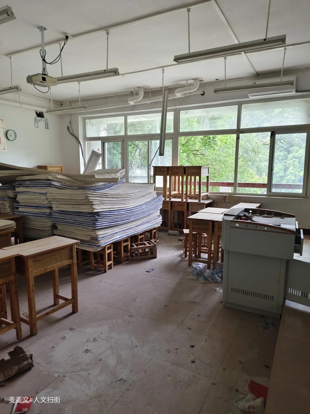 要抵达校园,得先穿过一条幽深的石砌隧道,隧道上方写着慧泉门,仿佛穿越回千禧年的校园时光。如今这里只剩满目荒芜:黑板上还留着“高考后我想”的未竟字迹,“学而不厌,锲而不舍”的标语仍悬在墙,老式木质课桌椅蒙尘,宿舍高低床空荡,曾经人声鼎沸的阶梯教室、篮球场,只剩风雨侵蚀的痕迹。