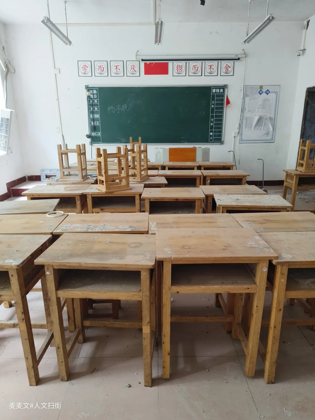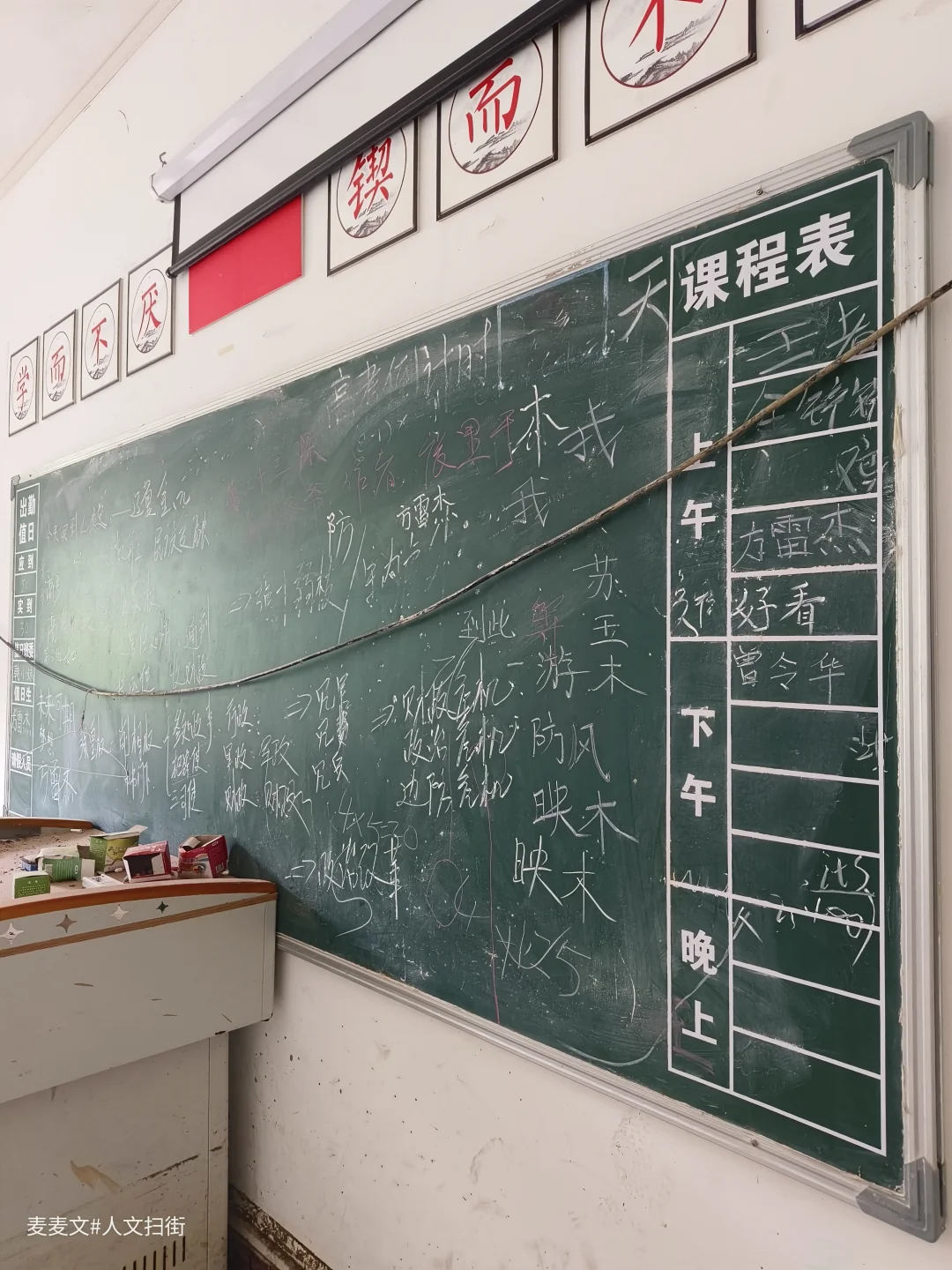 推开一间间教室门的瞬间,时光仿佛停摆。木质课桌上还留着当年的涂鸦与零食残渣,黑板上“高考后我想”的粉笔字没写完,课程表上的名字还清晰可见,“学而不厌,锲而不舍”的标语依旧挂在墙顶。公示栏里的资助政策告知书、班级合照里鲜活的笑脸、“静心教书”的标语,都在诉说着这里曾经的书声琅琅。