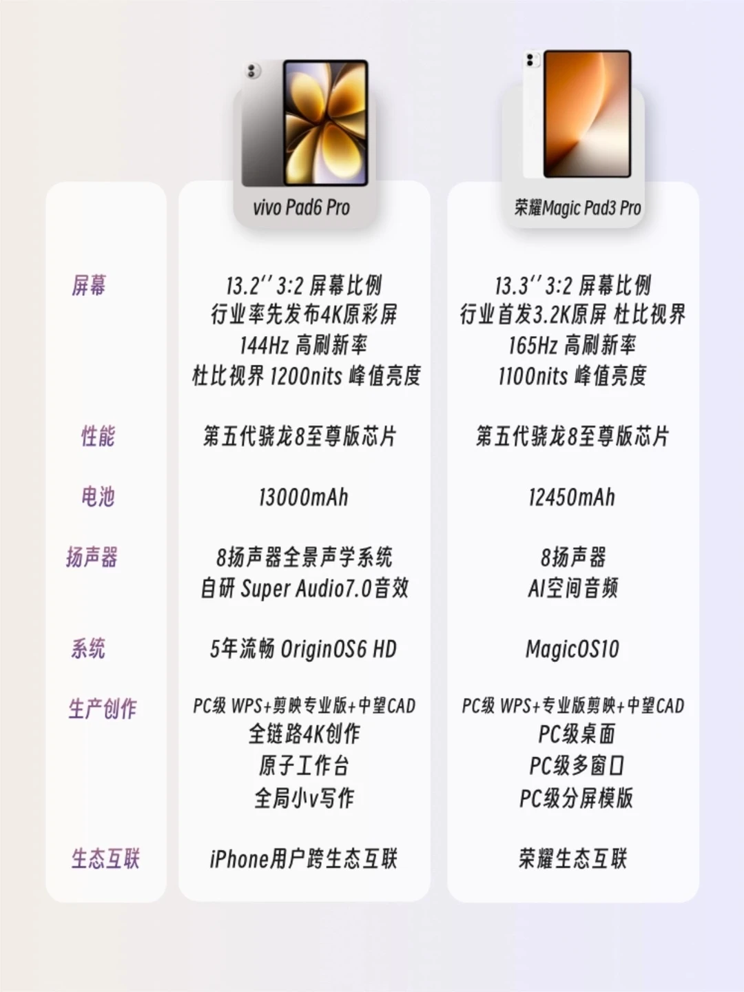 而我注意到vivo Pad6 Pro 不仅相比上一代 Pad5 Pro 全方位升级,对比同代的其他品牌平板也有不小的优势: