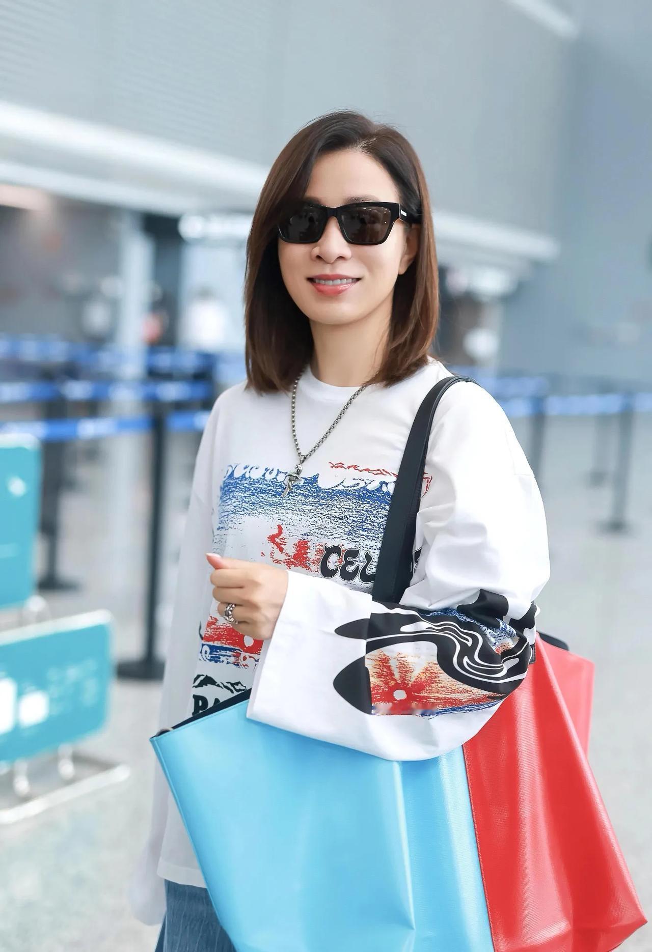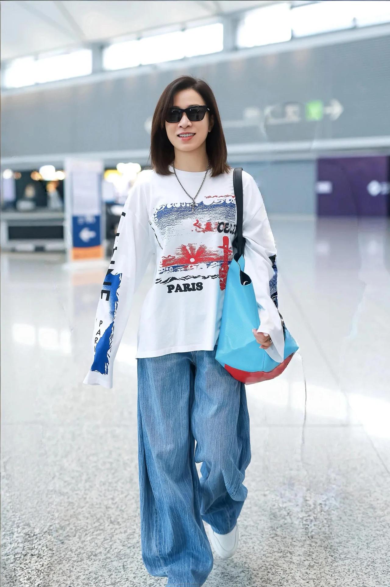 佘诗曼机场生图状态绝了! 印花长袖配牛仔裤,简约又高级 松弛感穿搭的天花板,日常