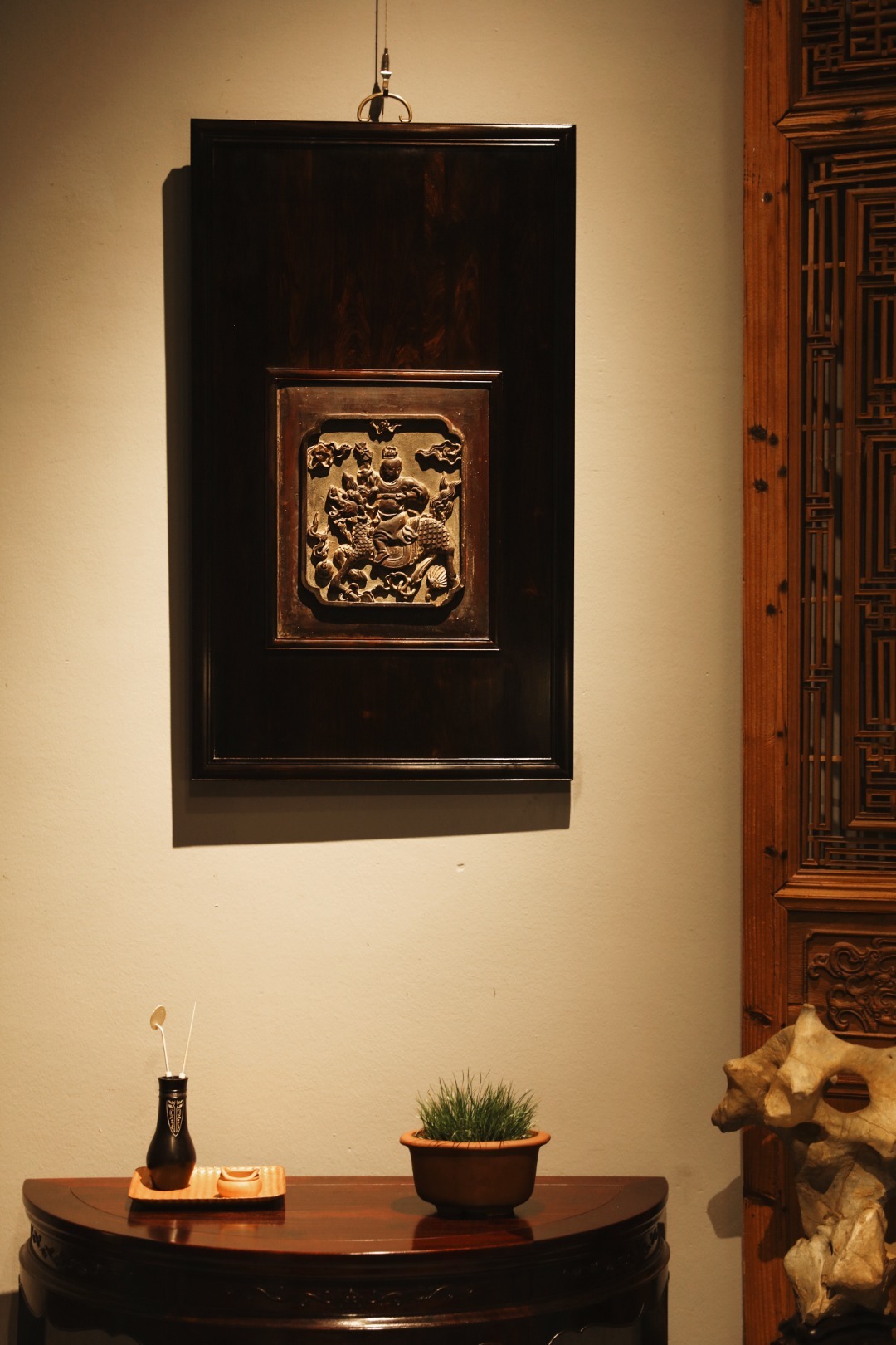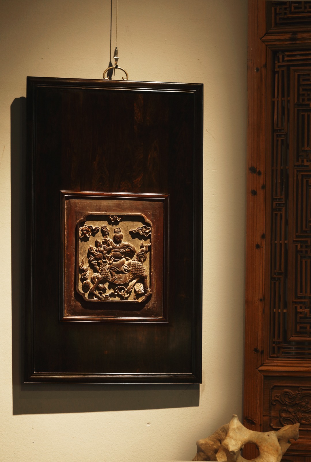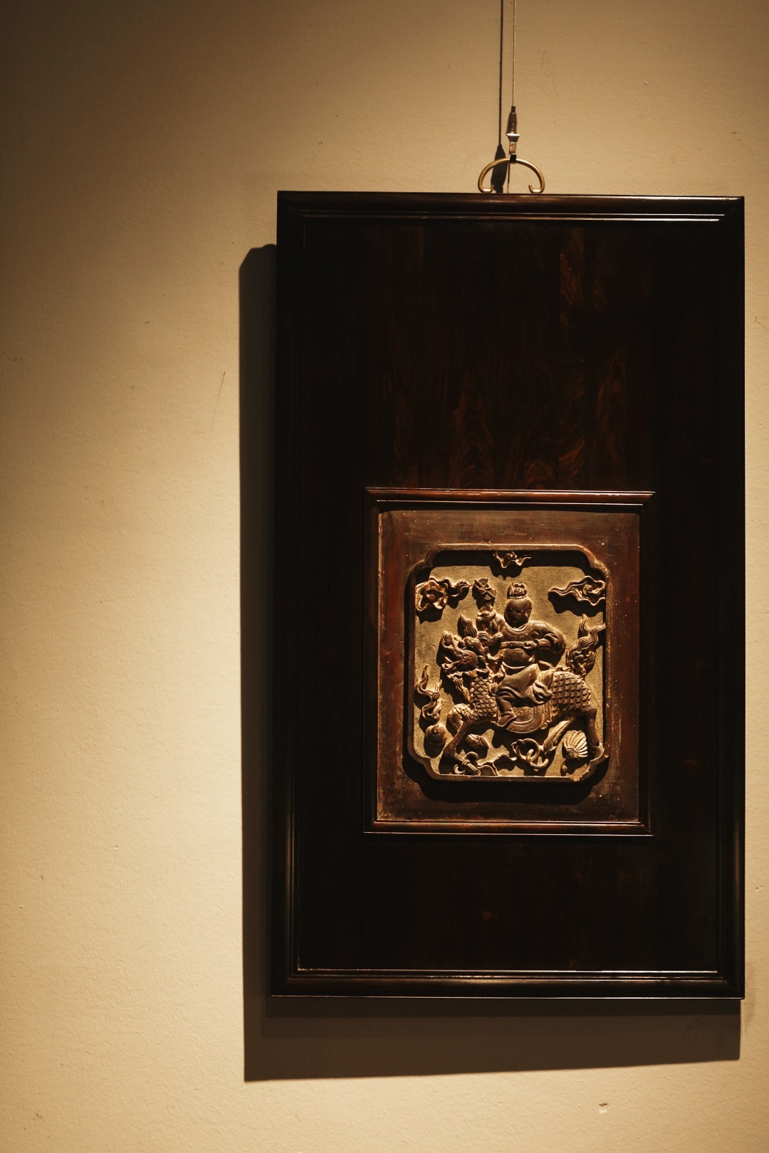 紫光檀攒框,屏心嵌清代老花板,鎏金原漆皮壳高浮雕人物麒麟图,寓意祥瑞。悬于雅室,无不古意盎然,富有诗情画意。