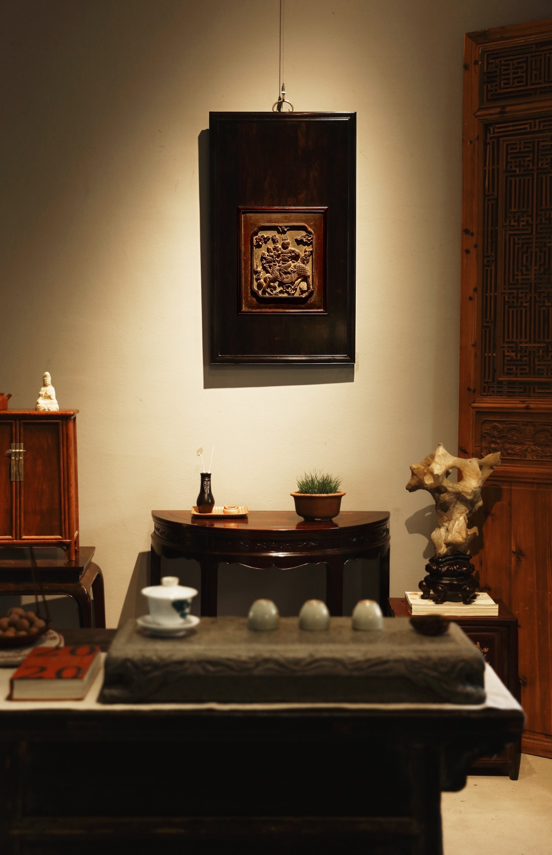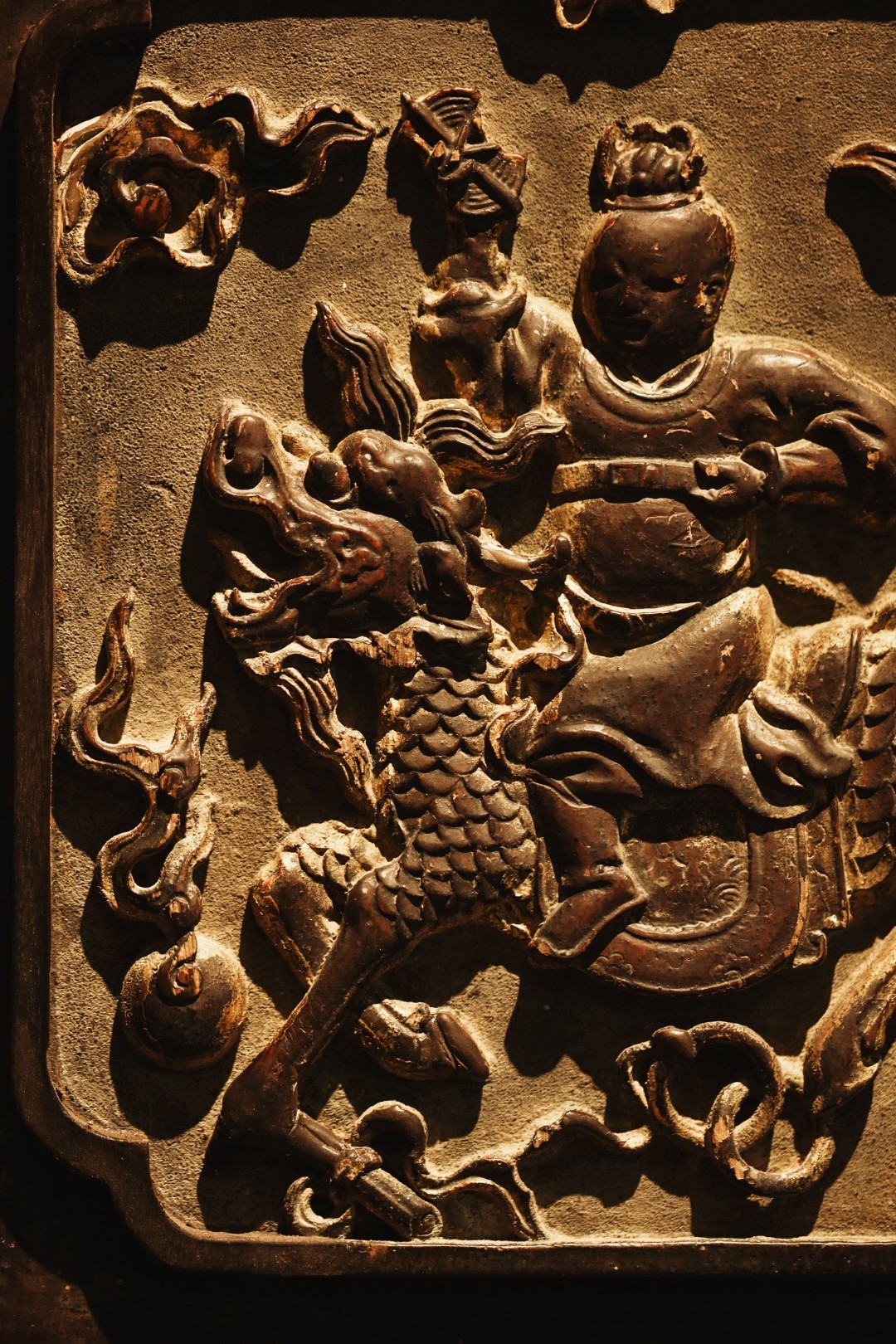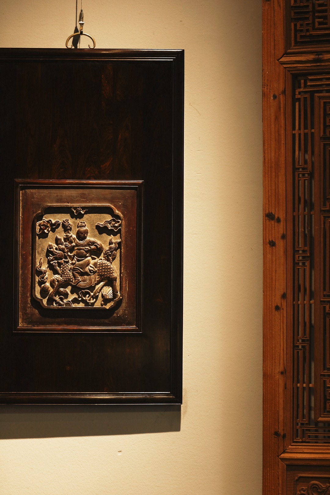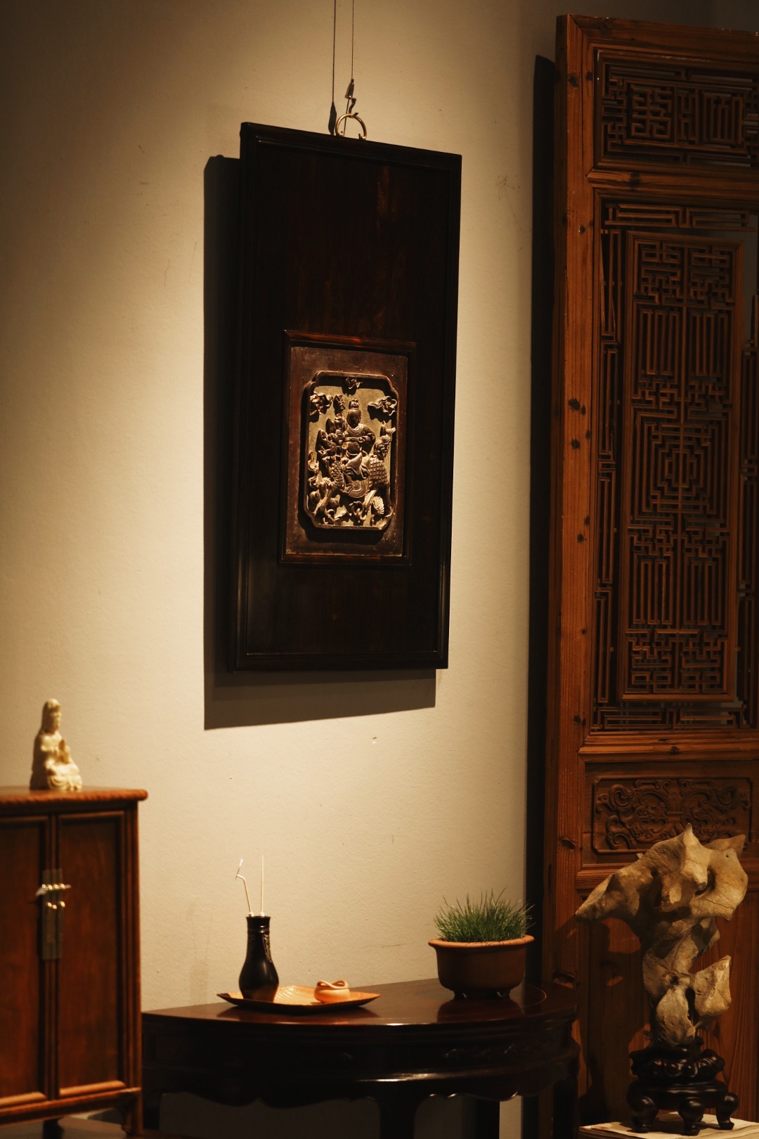 紫光檀攒框,屏心嵌清代老花板,鎏金原漆皮壳高浮雕人物麒麟图,寓意祥瑞。悬于雅室,无不古意盎然,富有诗情画意。