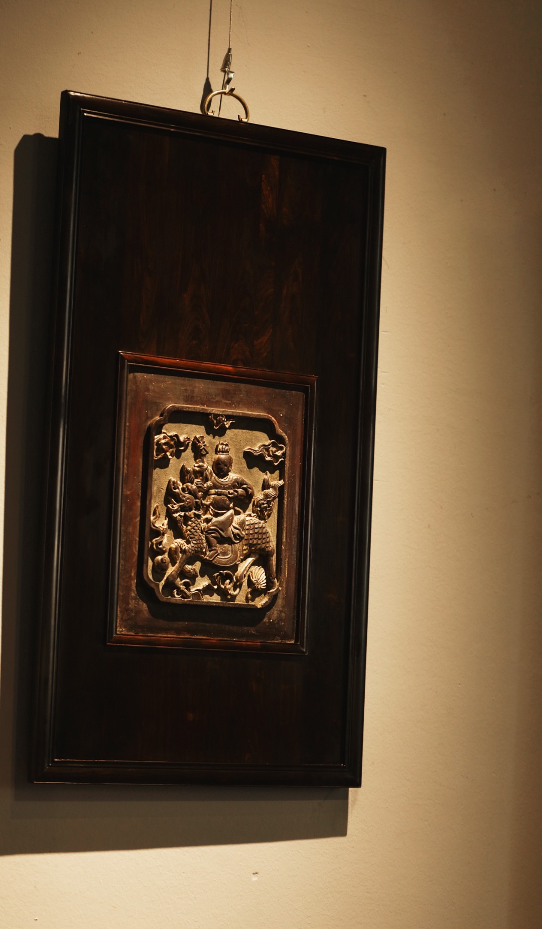 紫光檀x老花板【麒麟献瑞】挂屏紫光檀攒框,屏心嵌清代老花板,鎏金原漆皮壳高浮雕人