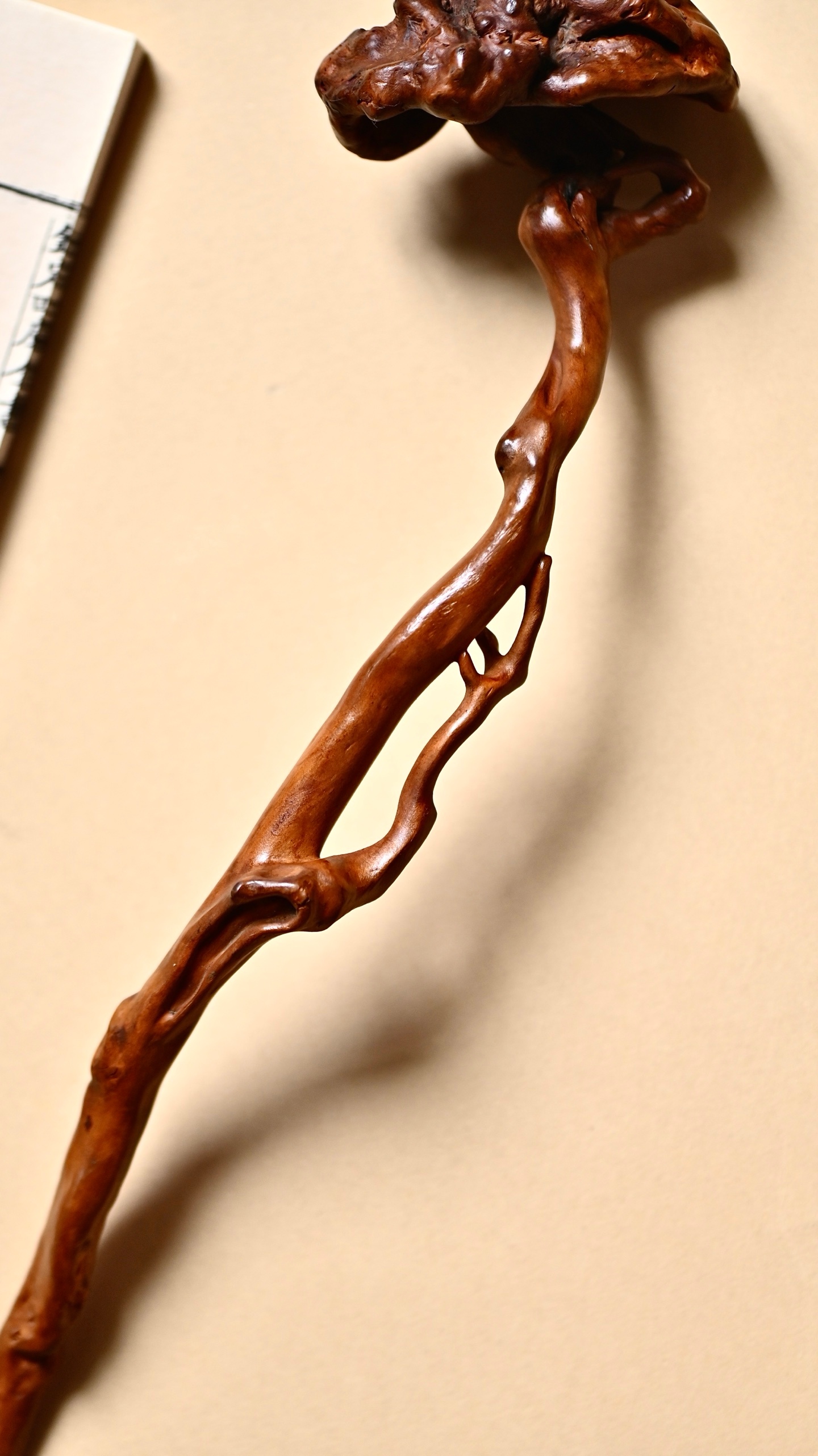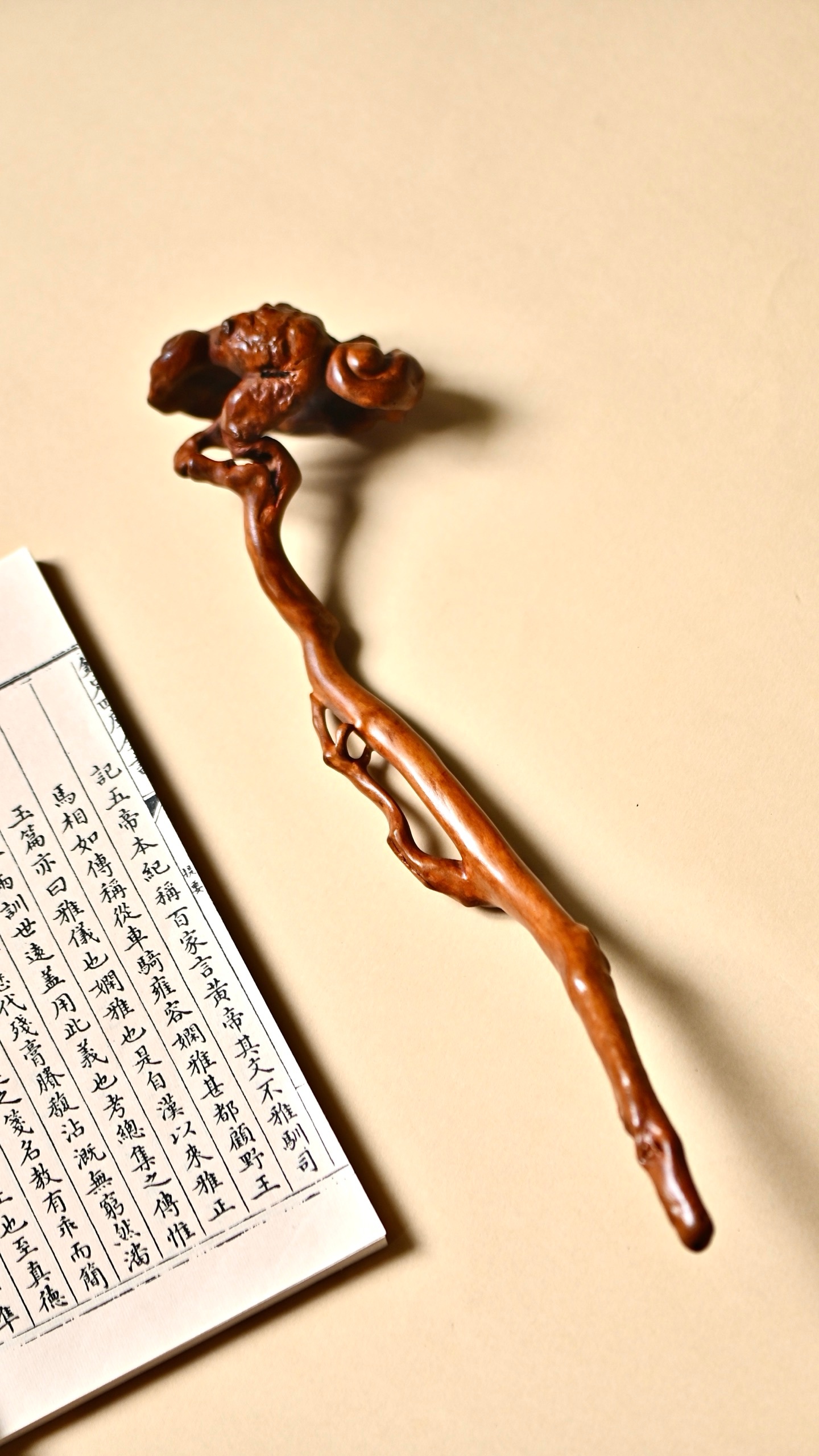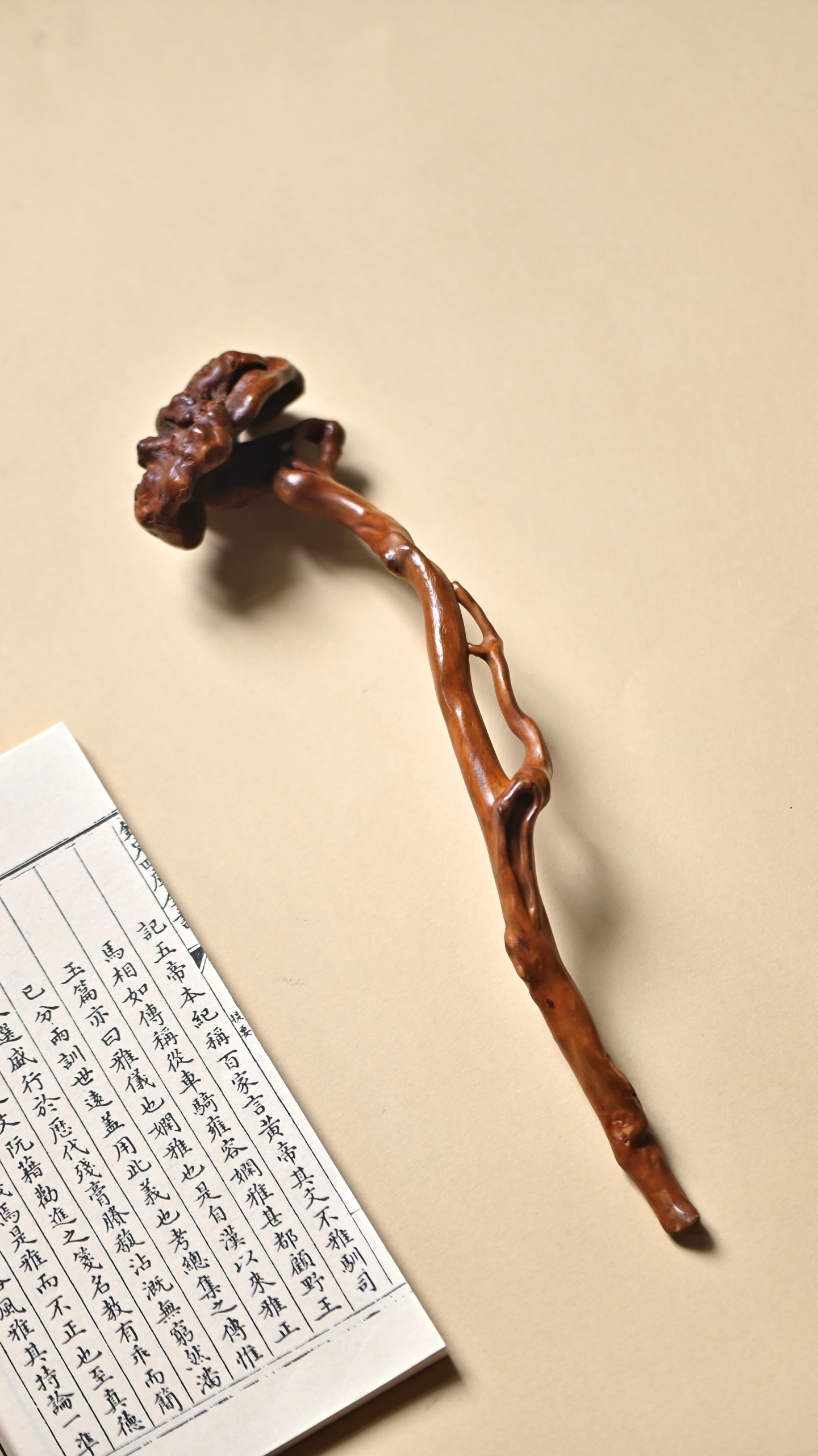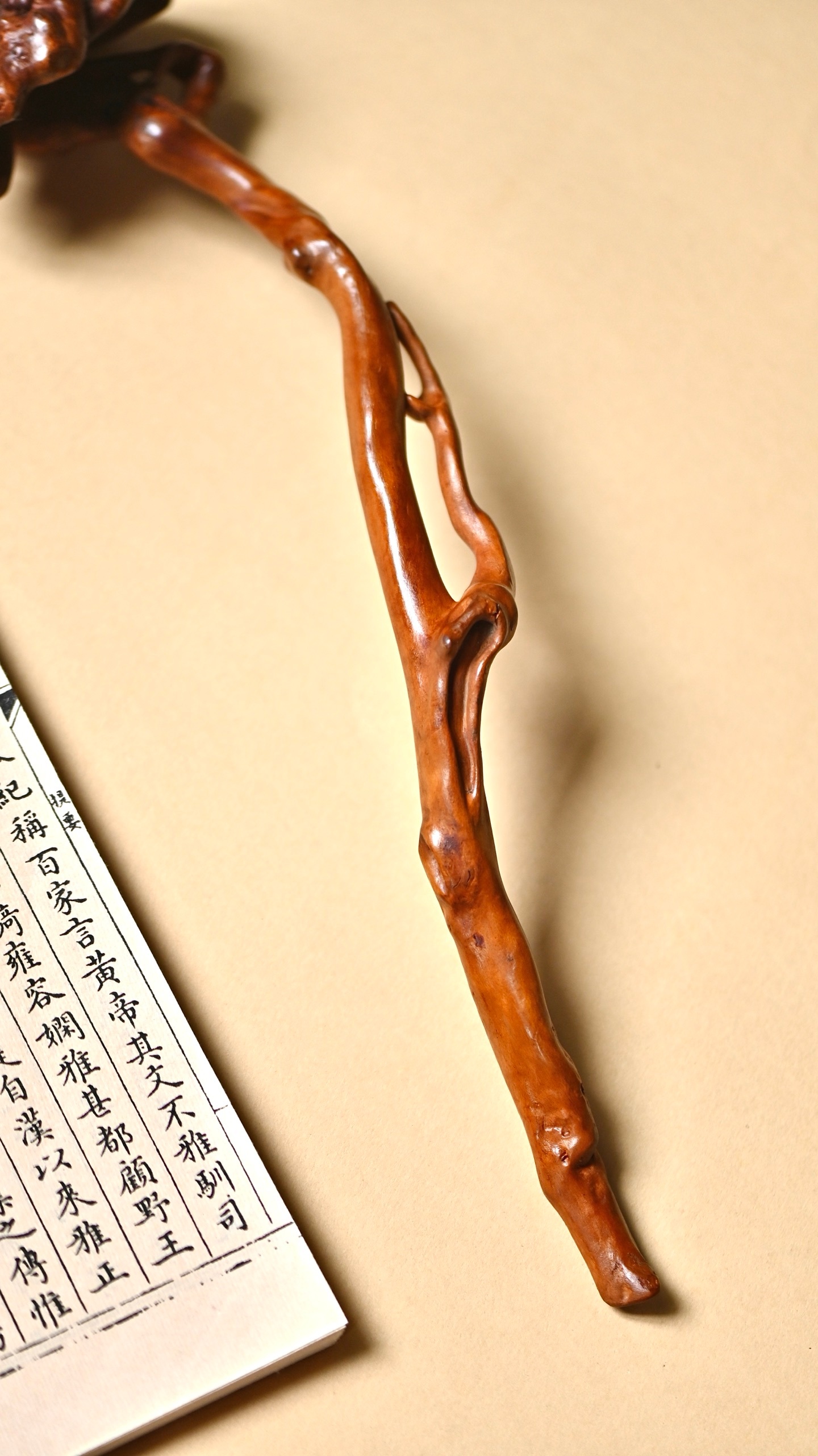 匠人循木之天然走势,雕作灵芝之形:柄身盘曲如枝,纹理若隐若现。首端以天然木瘤为芯,辅以圆雕灵芝菌盖,卷云纹层叠舒展。黄杨自古为“木中君子”,温润而不张扬;灵芝如意则是中式传统的祥瑞之物,象征顺遂圆满。二者相合,置于案头,既是文房清供的点睛之笔,也是日常赏玩、摩挲静心的雅器。