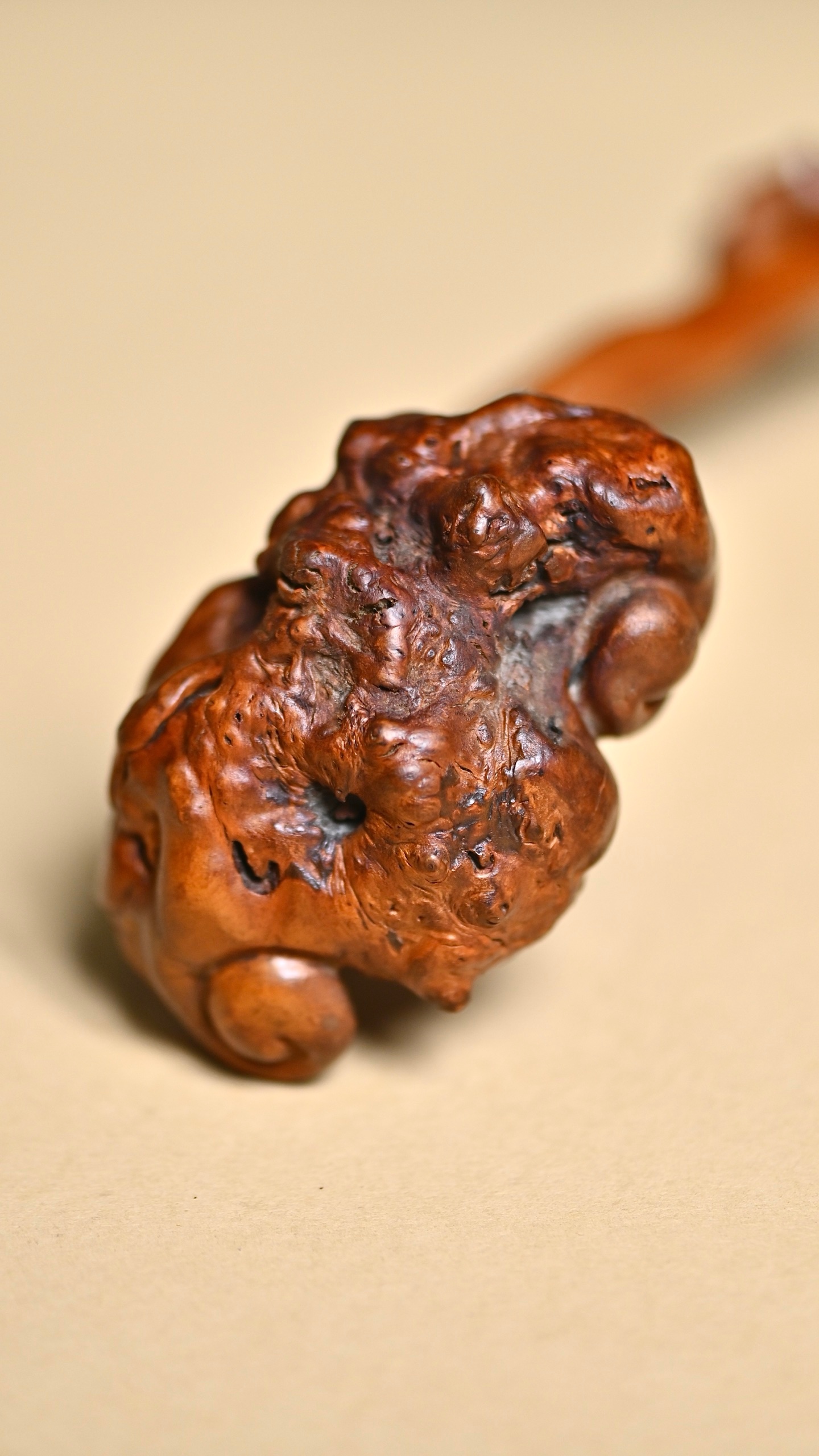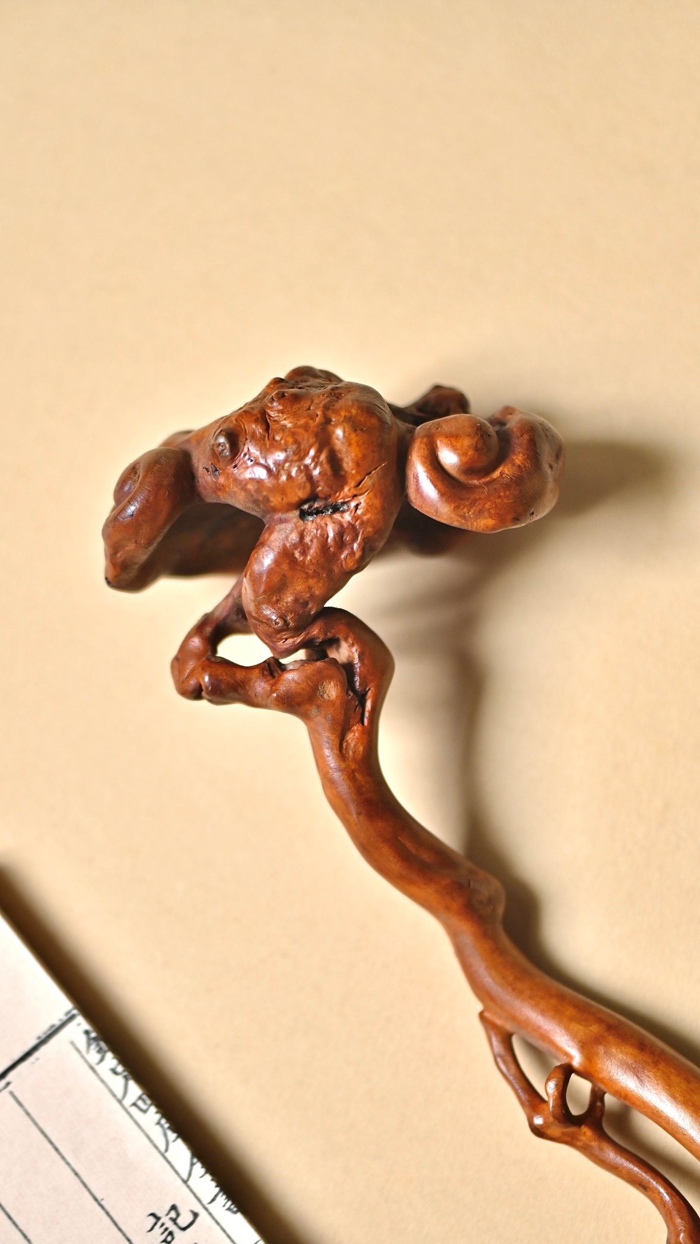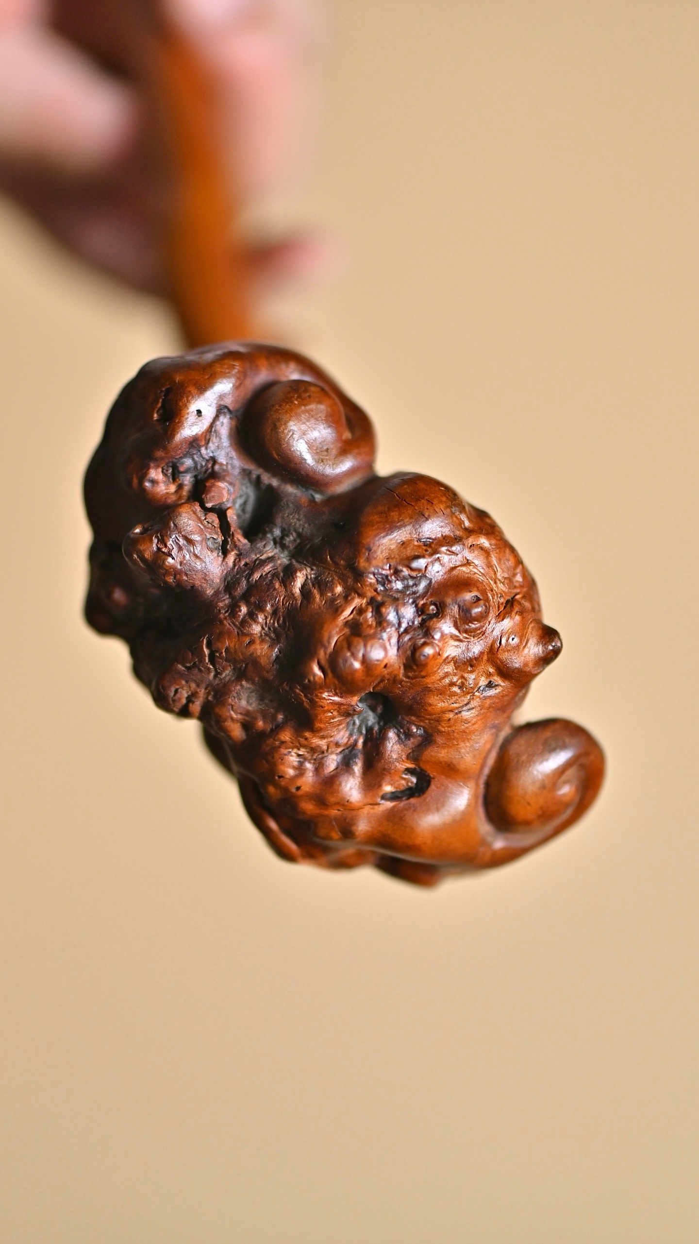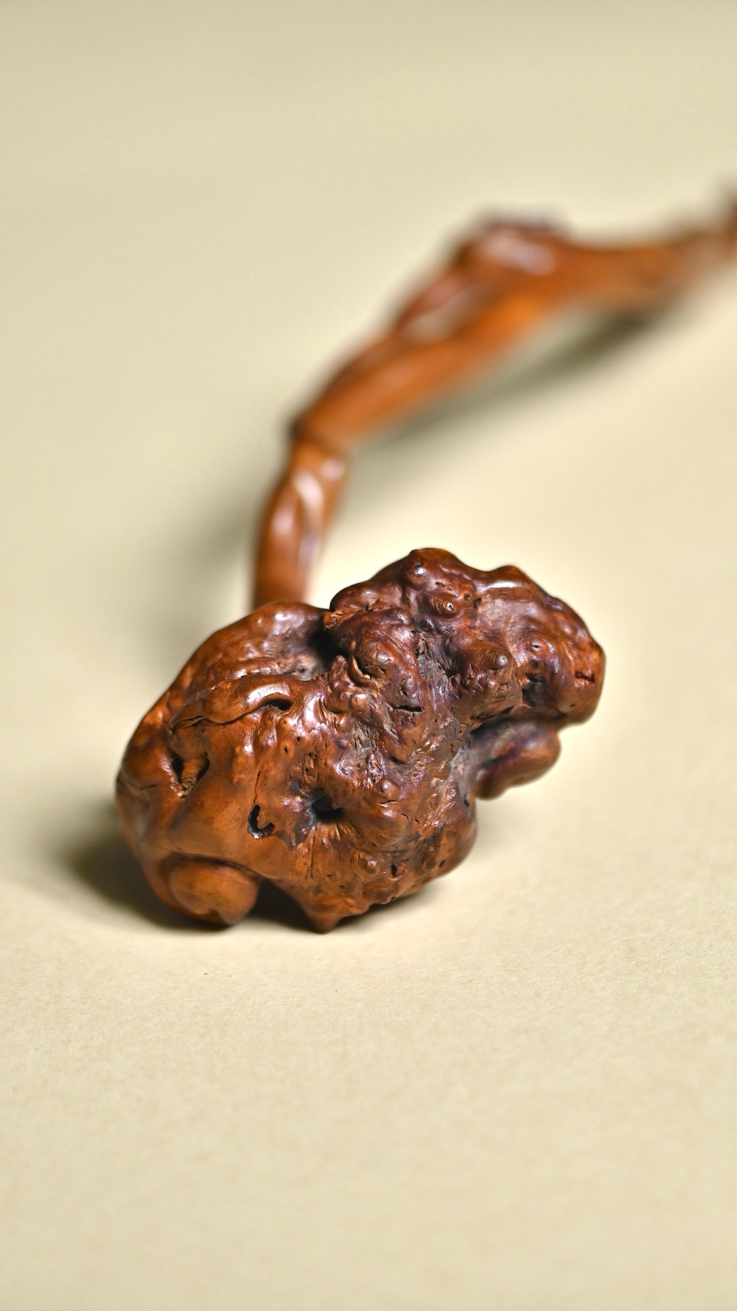 匠人循木之天然走势,雕作灵芝之形:柄身盘曲如枝,纹理若隐若现。首端以天然木瘤为芯,辅以圆雕灵芝菌盖,卷云纹层叠舒展。黄杨自古为“木中君子”,温润而不张扬;灵芝如意则是中式传统的祥瑞之物,象征顺遂圆满。二者相合,置于案头,既是文房清供的点睛之笔,也是日常赏玩、摩挲静心的雅器。