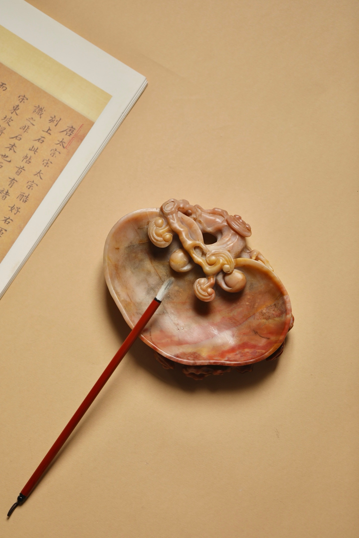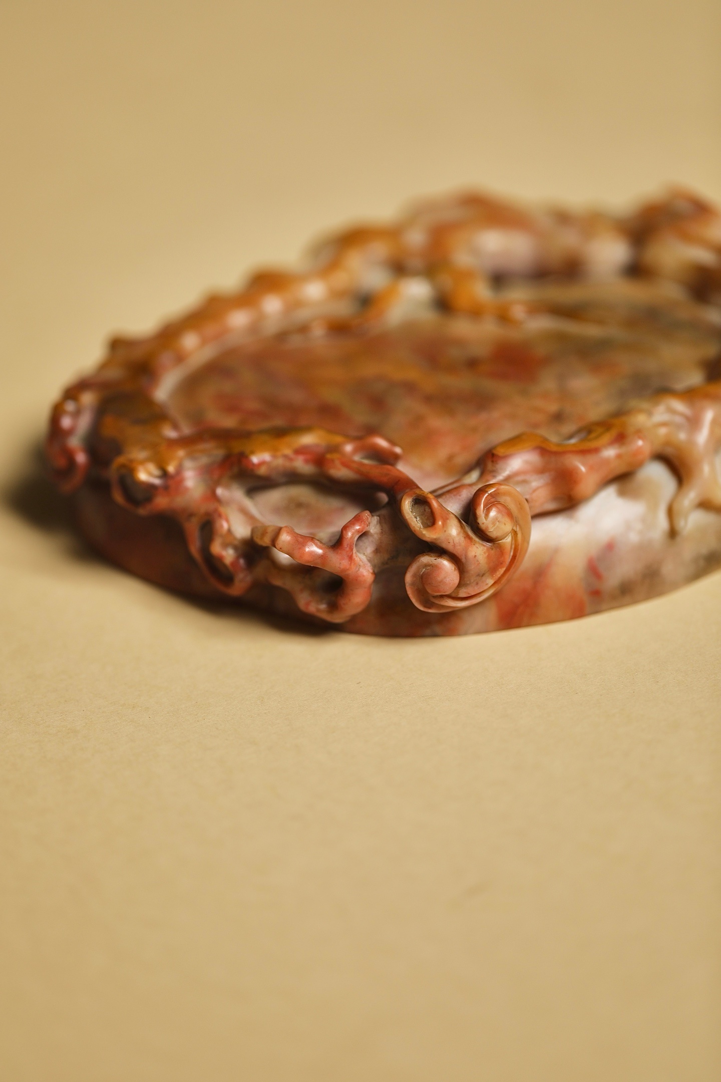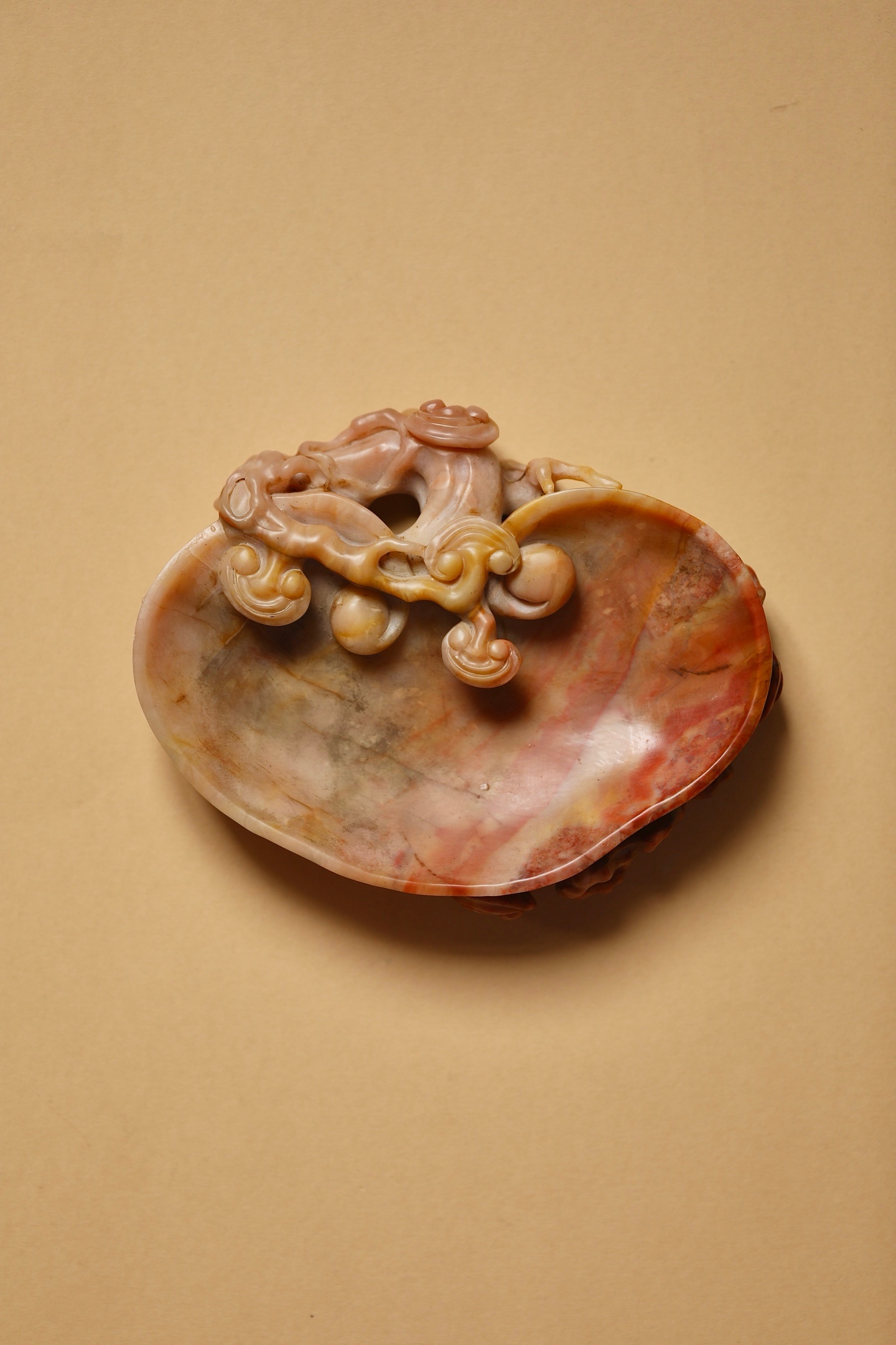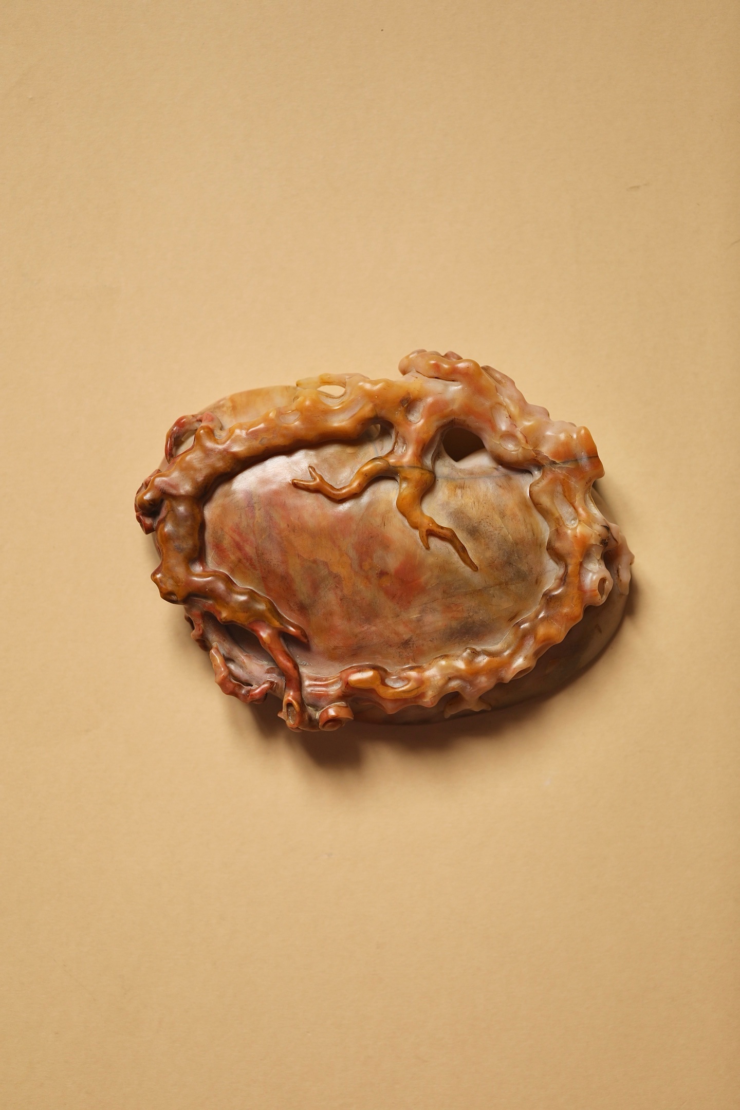 石质温润凝腻,自带粉、红、赭交融的天然肌理,如霞染石间,气韵天成。以圆雕、透雕技法,随形雕琢灵芝纹饰:洗沿盘曲的枝干苍劲遒逸,灵芝菌盖层叠舒展,卷云纹与孔洞虚实相生,刀工婉转流畅,尽显“瘦、透、漏”的文房审美。笔洗内膛圆润光洁,线条随石形自然起伏,既保留了寿山石的天然之美,又兼顾了文房实用。