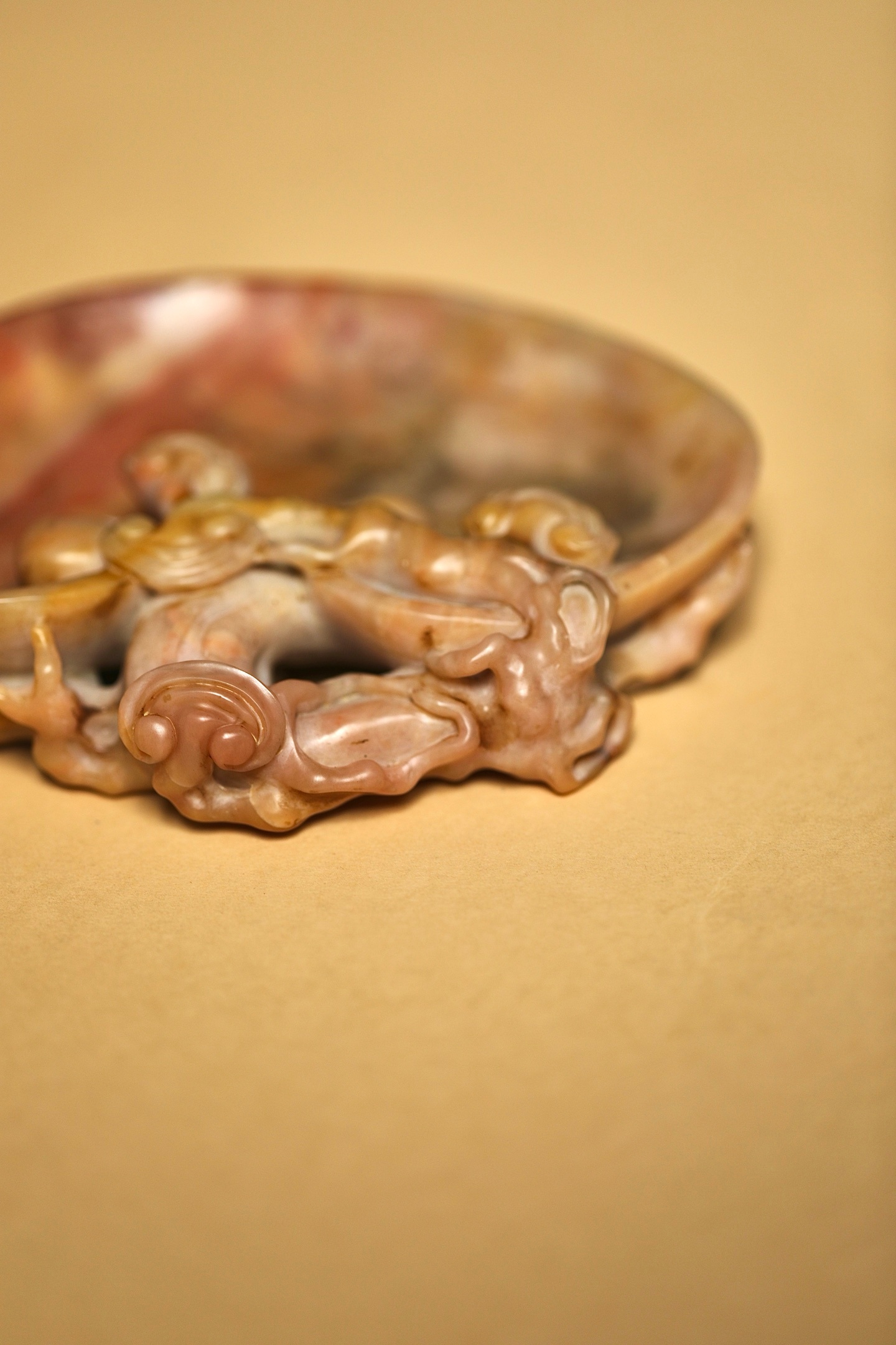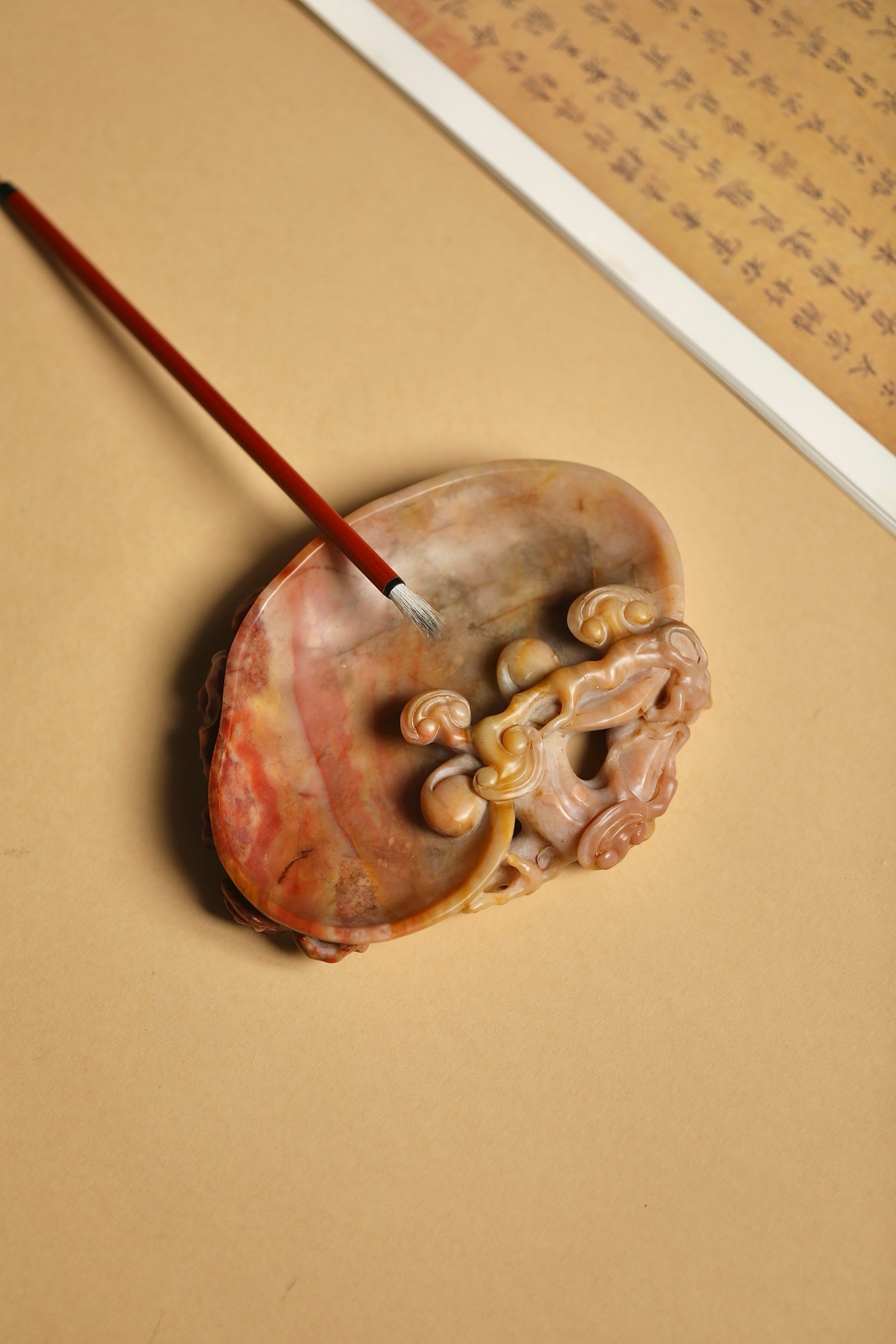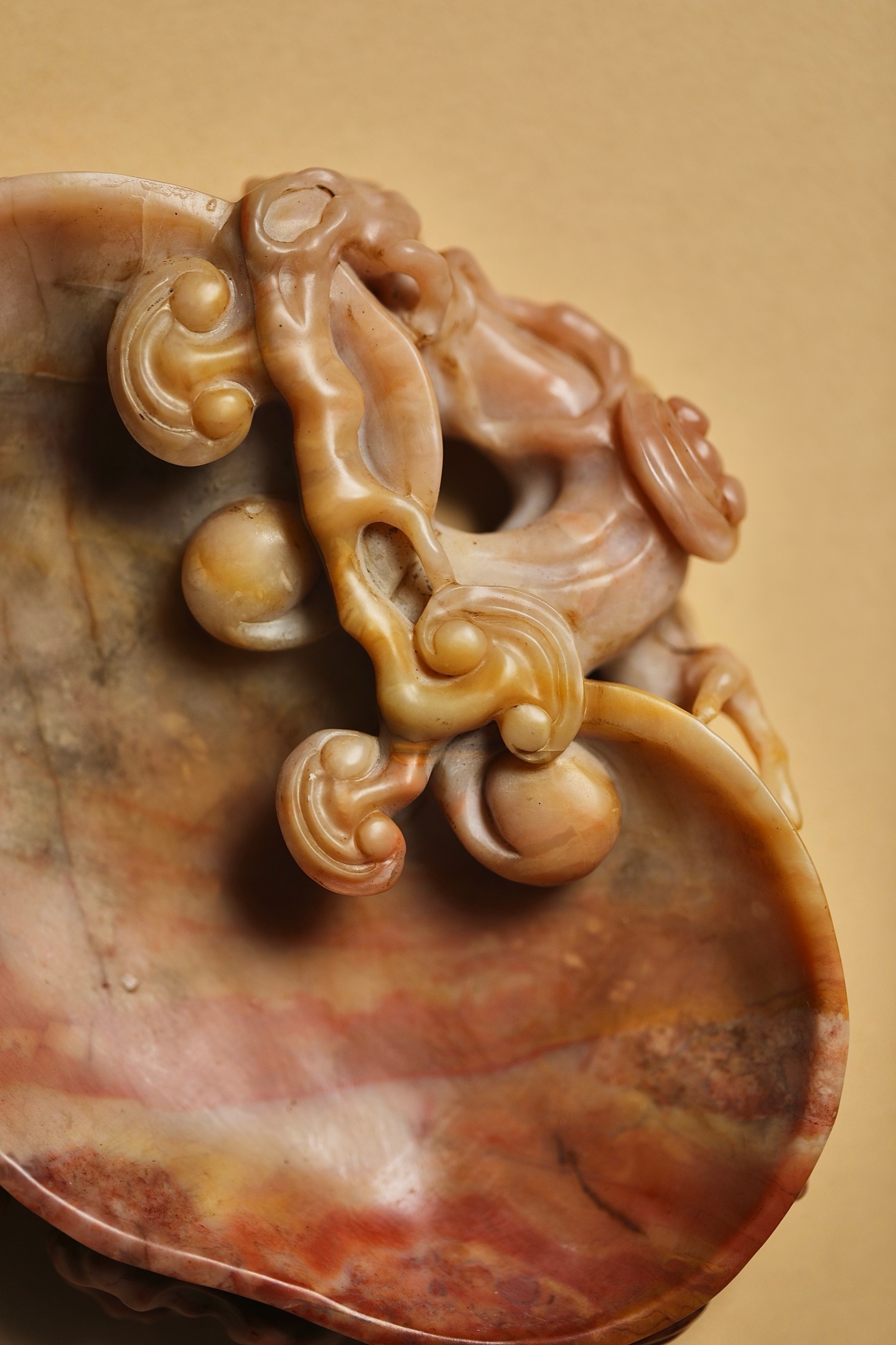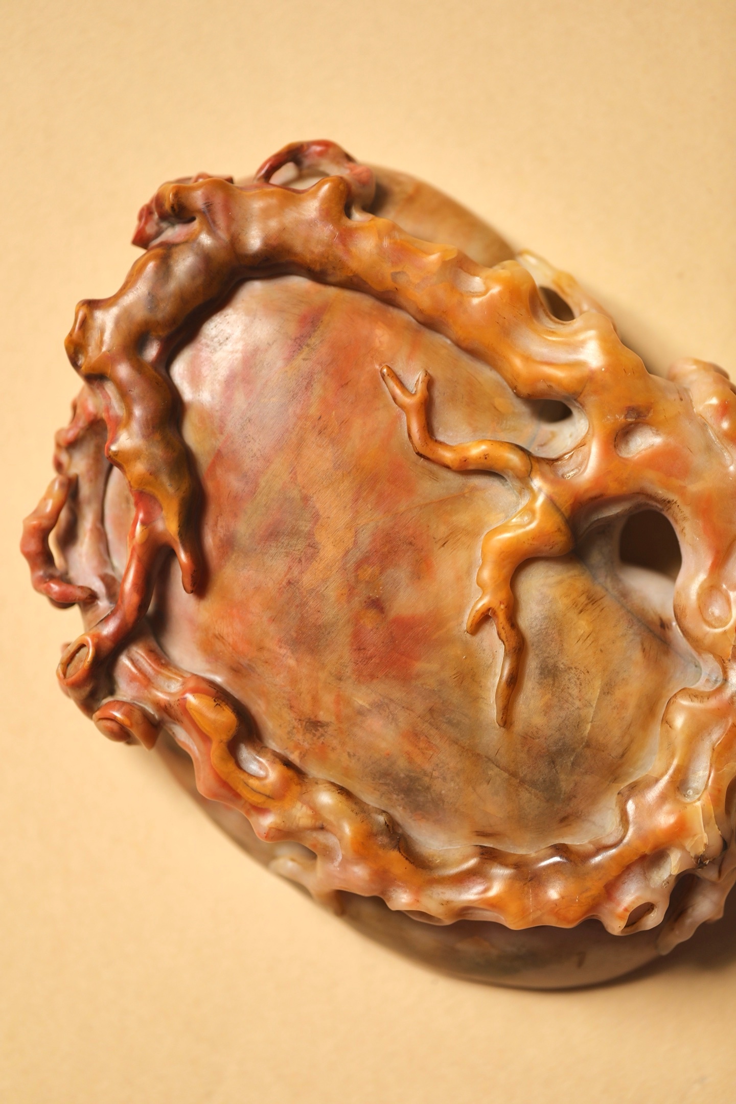 石质温润凝腻,自带粉、红、赭交融的天然肌理,如霞染石间,气韵天成。以圆雕、透雕技法,随形雕琢灵芝纹饰:洗沿盘曲的枝干苍劲遒逸,灵芝菌盖层叠舒展,卷云纹与孔洞虚实相生,刀工婉转流畅,尽显“瘦、透、漏”的文房审美。笔洗内膛圆润光洁,线条随石形自然起伏,既保留了寿山石的天然之美,又兼顾了文房实用。
