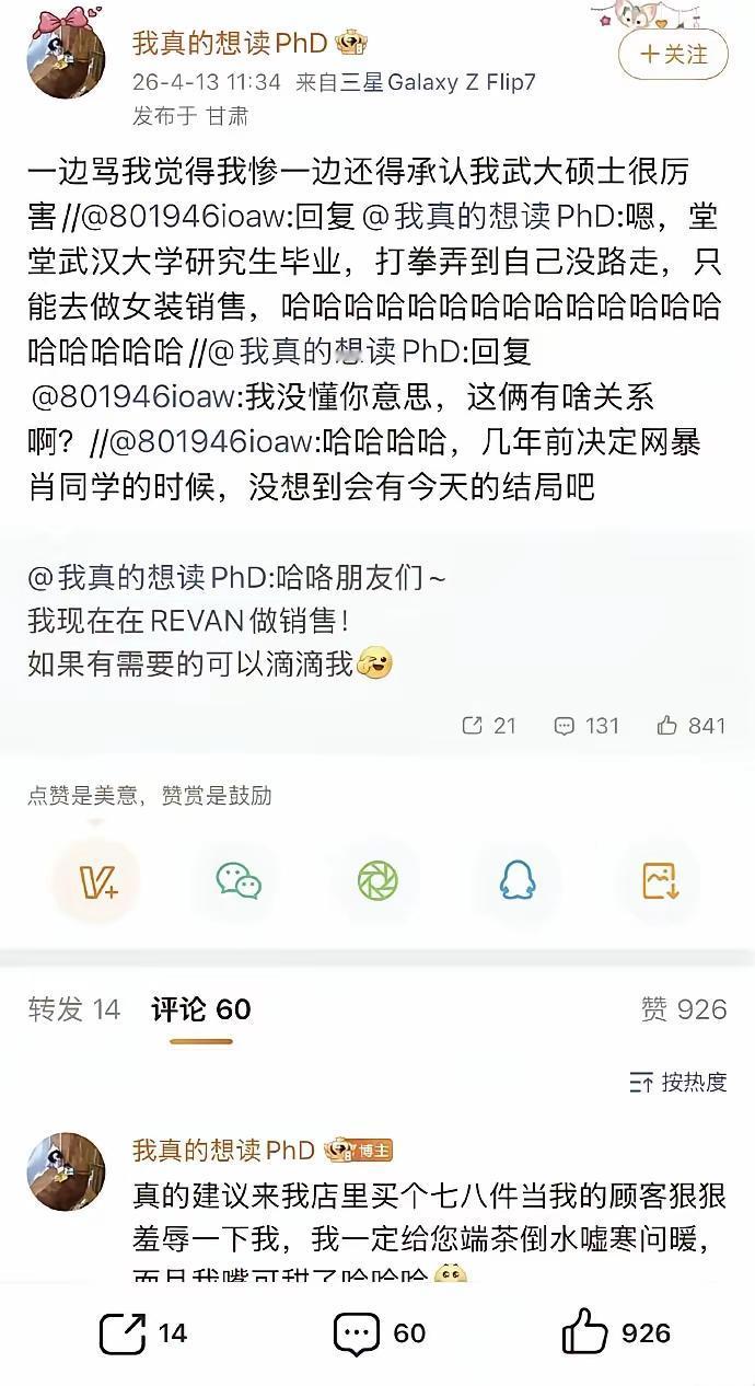 既然杨同学已经回到兰州做女装销售了,想必生活一定会让杨同学有许多人生反思。希望她通过认真反思和艰辛努力,去圆她的博士梦,让‘’我真的想读phd ‘’变成现实,和以前那个杨同学拜拜!