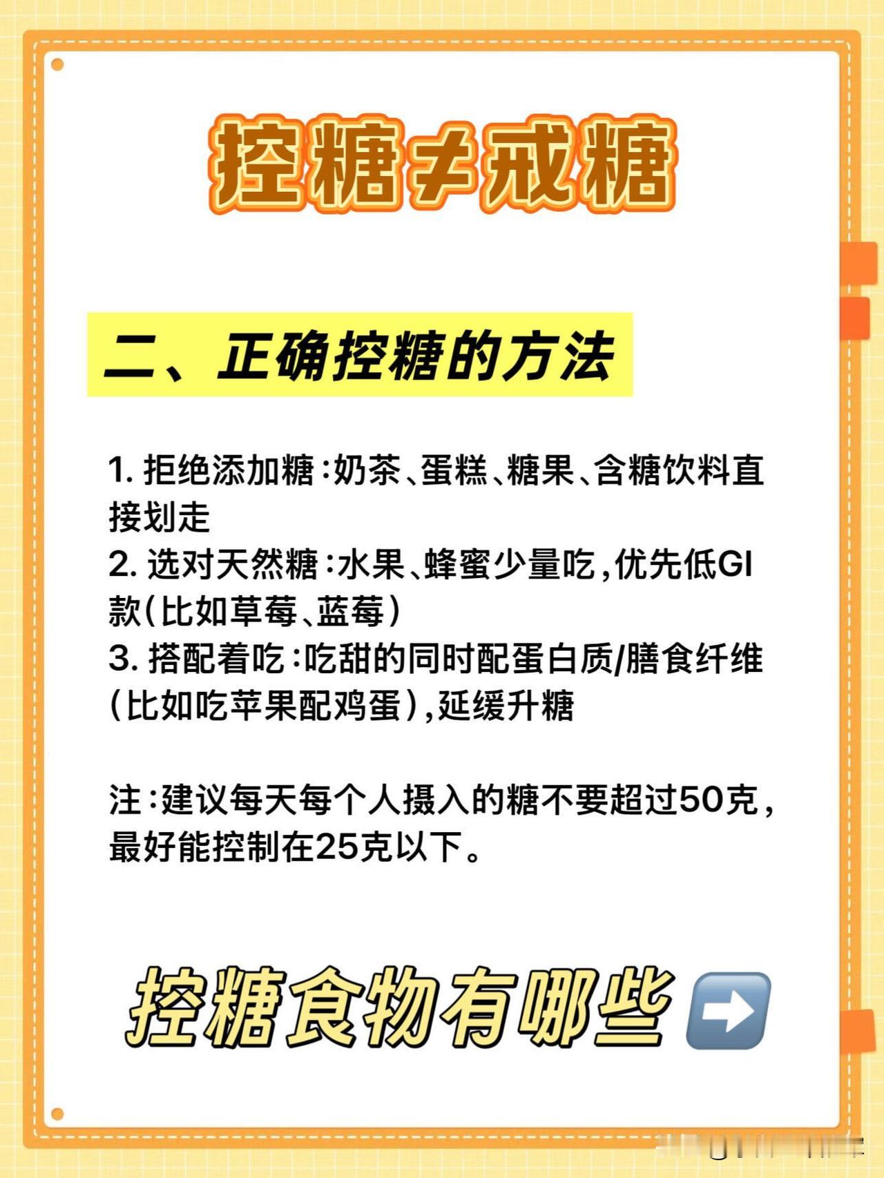 真正科学的控糖,核心是管住“添加糖”,选对“天然糖”,学会“搭配吃”。奶茶、蛋糕、糖果、含糖饮料里的添加糖,直接彻底划走;水果、蜂蜜这类天然糖要少量吃,优先选草莓、蓝莓等低GI品种;吃甜的同时搭配蛋白质或膳食纤维,比如苹果配鸡蛋,能有效延缓血糖飙升。建议每天糖摄入量不超过50克,最好控制在25克以下。