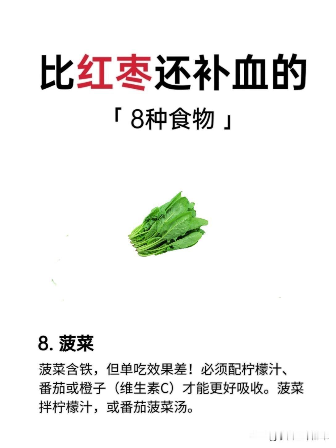 • 食用建议:单吃补铁效果差,必须搭配柠檬汁、番茄、橙子等富含维生素C的食物,才能大幅提升铁的吸收率,推荐菠菜拌柠檬汁、番茄菠菜汤。
