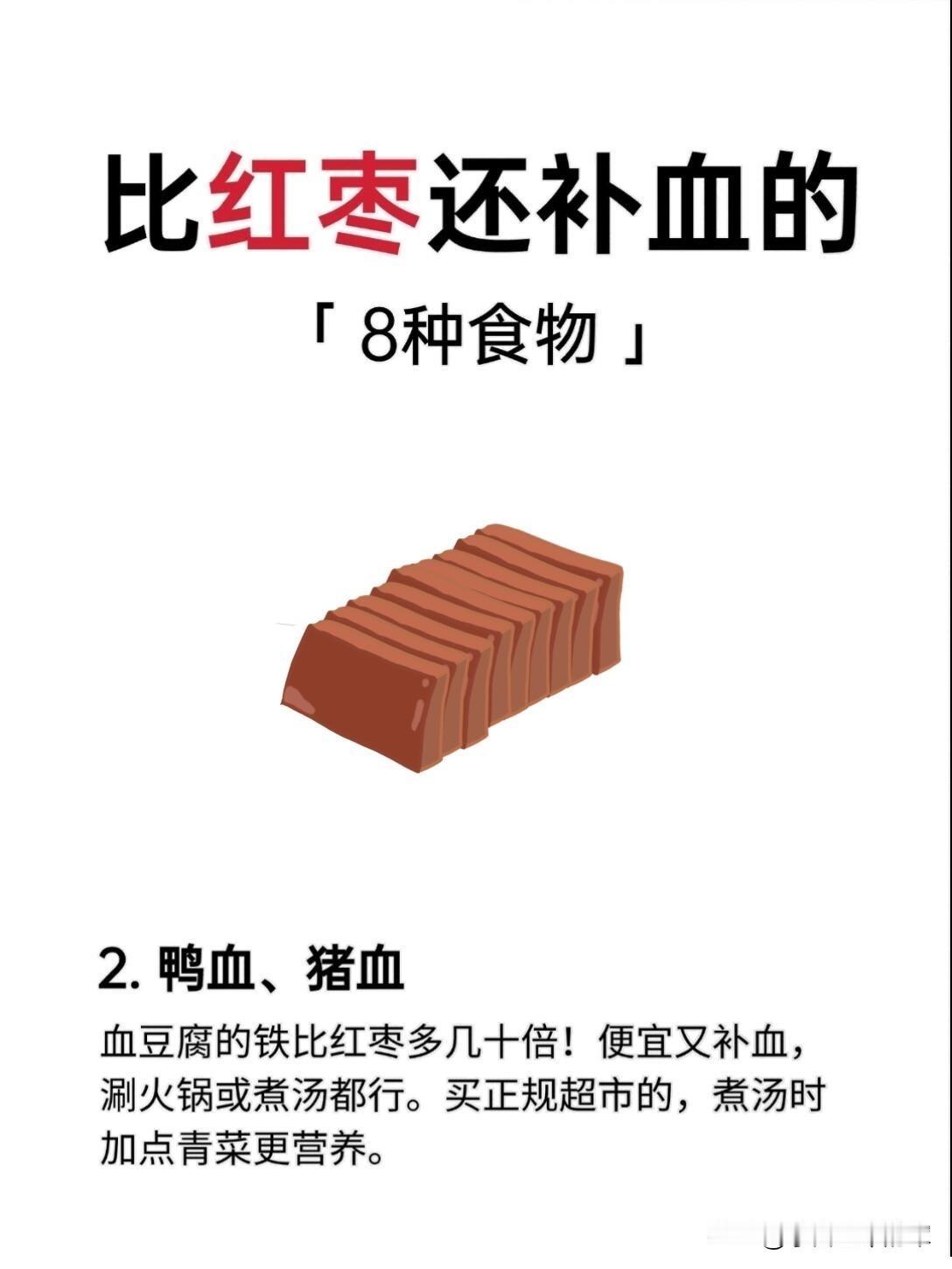 • 核心优势:血豆腐中的铁为血红素铁,含量是红枣的几十倍,吸收率高,且价格亲民。