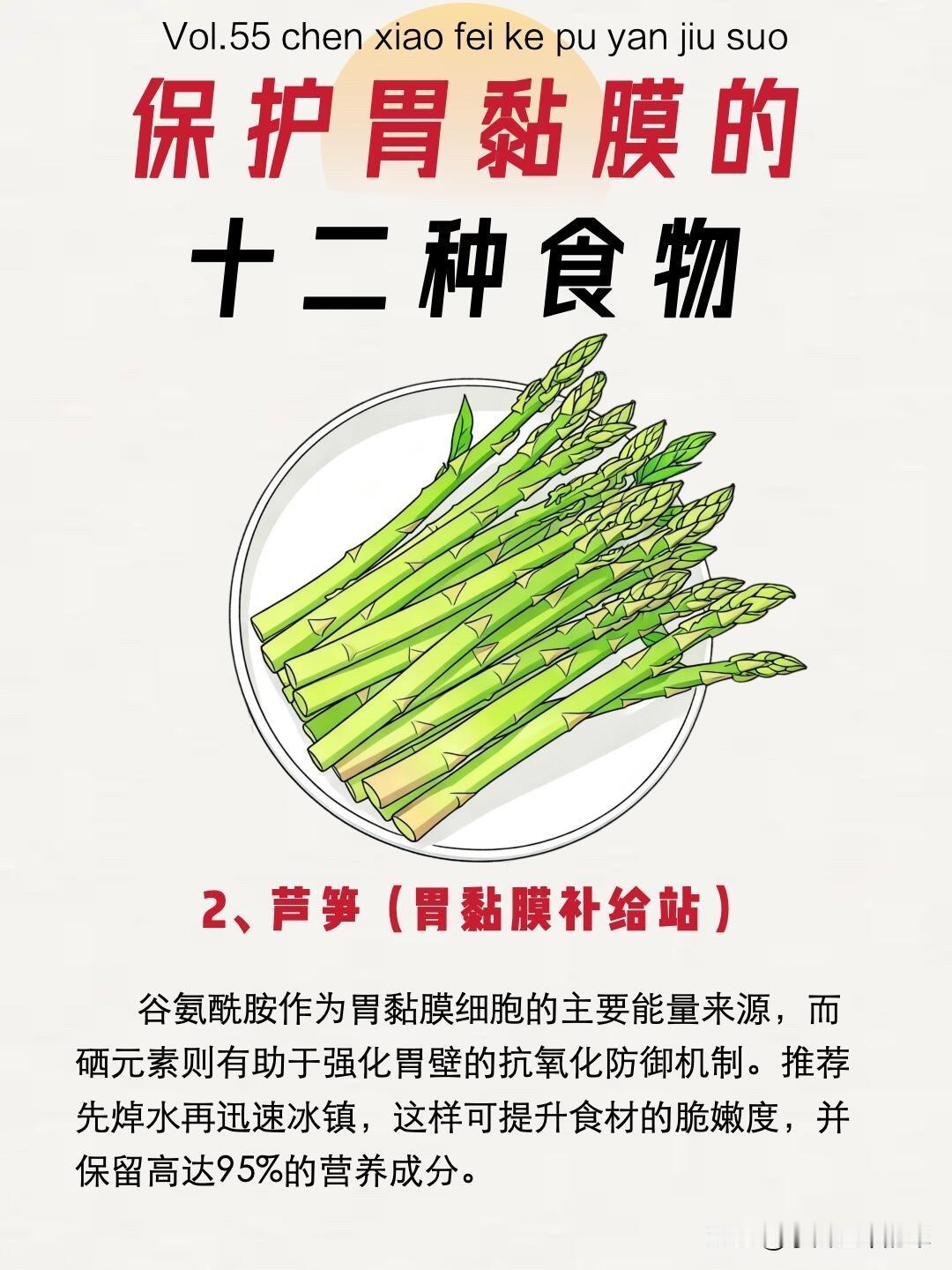 芦笋的谷氨酰胺给胃黏膜供能,硒元素强化抗氧化防御;苹果果胶包裹黏膜减少摩擦,槲皮素缓解反酸;紫甘蓝的萝卜硫素激活抗氧化系统,维生素U促进溃疡再生;燕麦的β-葡聚糖形成凝胶保护层,促进益生菌增殖。