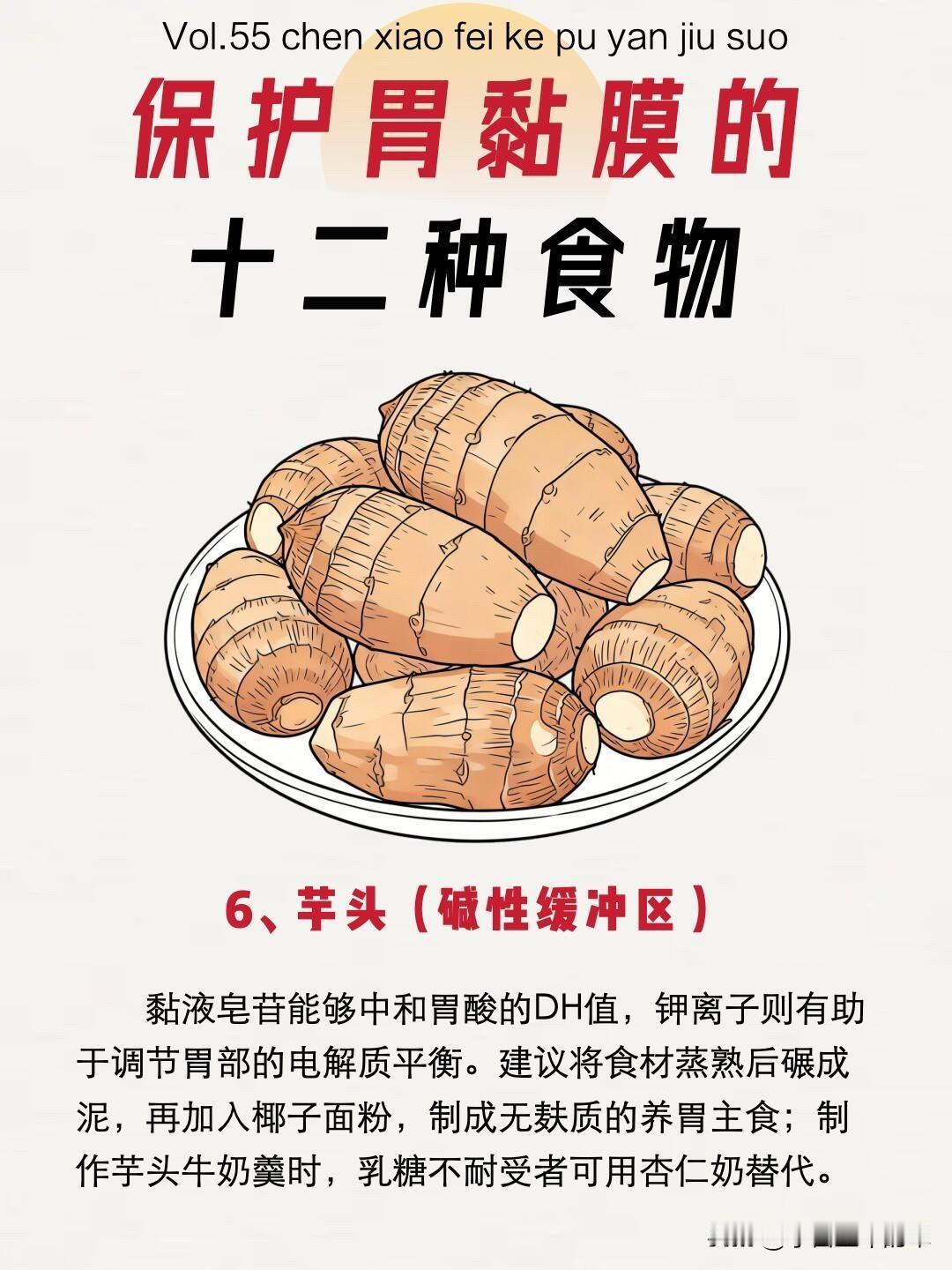 小米油里的谷维素可修复黏膜,搭配南瓜红枣三重护胃;山药的粘液蛋白和淀粉酶,和小米同煮修复力翻倍;芋头的粘液皂苷中和胃酸,钾离子调节胃部电解质平衡。莲藕的鞣质能修复溃疡面,淀粉包裹胃壁减少刺激;南瓜的β-胡萝卜素中和自由基,锌元素加速黏膜修复。