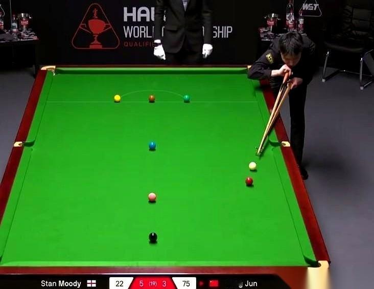 开局2:0,顺风顺水。第三局,桌上只剩几颗球,他已经超分,对手穆迪基本可以准备下一局了。