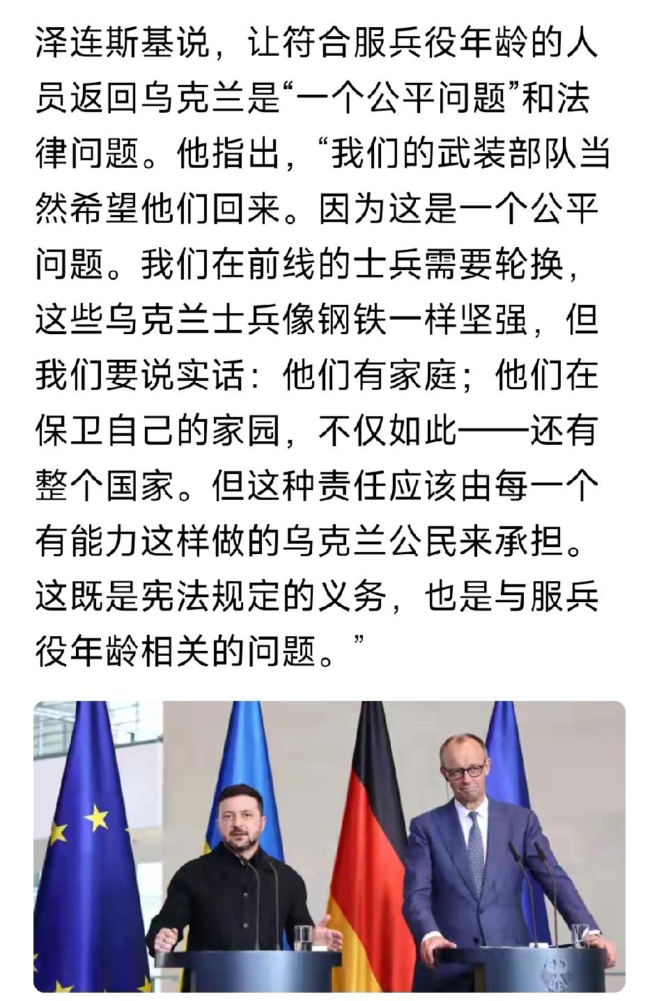 泽连斯基:让符合服兵役年龄的人员返回乌克兰是一个公平问题和法律问题。我们在前线的士兵需要轮换,这些乌克兰士兵像钢铁一样坚强,但他们有家庭;他们在保卫自己的家园,不仅如此——还有整个国家。但这种责任应该由每一个有能力这样做的乌克兰公民来承担。这既是宪法规定的义务,也是与服兵役年龄相关的问题。