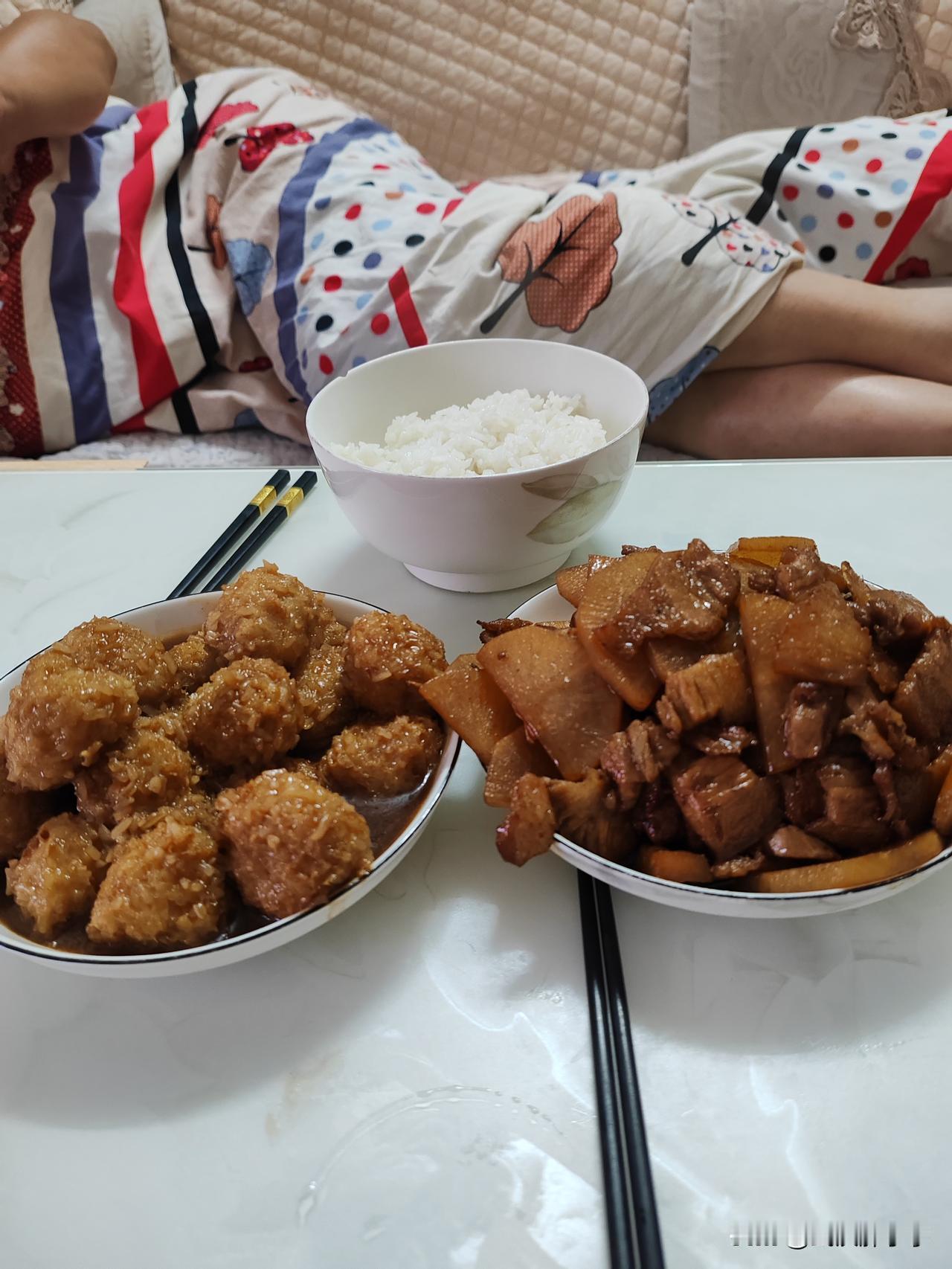 因为下雨也没买菜,家里还有半个萝卜一点五花肉拿出来化冻,再烧一盘糯米豆腐丸子,今天晚餐搞定了!