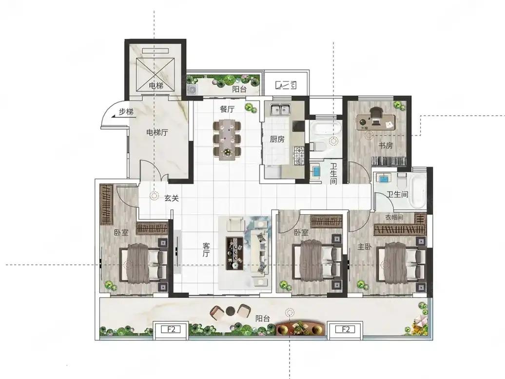 三开间朝南,主卧带衣帽间、独卫,次卧、书房分布合理,动静分区,互不打扰。双卫设计,干湿分离,细节里藏着生活的体面。这房子,是对生活的留白,给忙碌的人,一个慢下来的空间,在喧嚣里,守住内心的宁静。