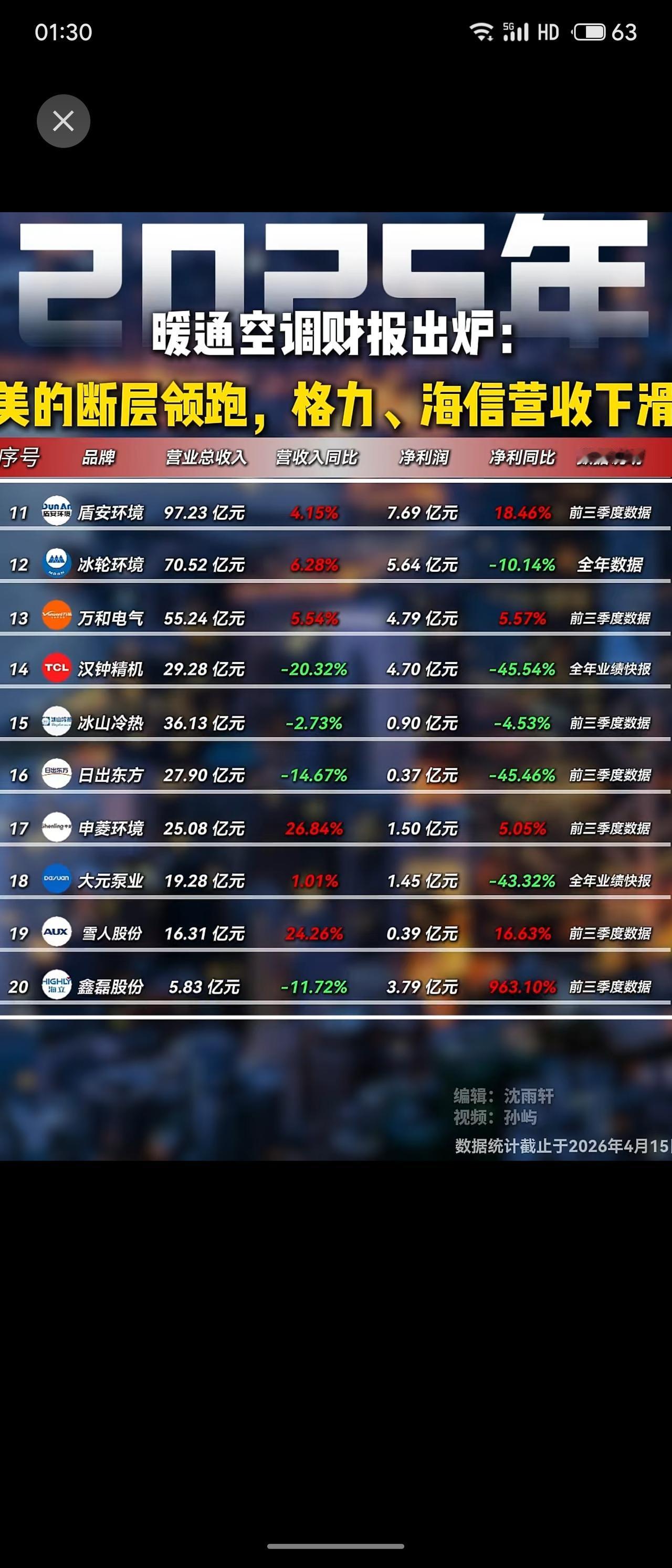 根据暖通家电行业最新财报(数据截至2026年4月15日),美的集团以4585亿元营收、12.11%的同比增幅断层领跑,净利润439.5亿元。海尔智家营收3023.47亿元,稳居第二。格力电器(前三季度)营收1376.54亿元,同比下降6.62%;海信家电全年营收879.28亿元,下降5.19%。TCL电子、四川长虹等实现增长,而格力、海信、万和、日出东方等多家企业出现营收或净利下滑。行业分化明显,美的优势持续扩大。