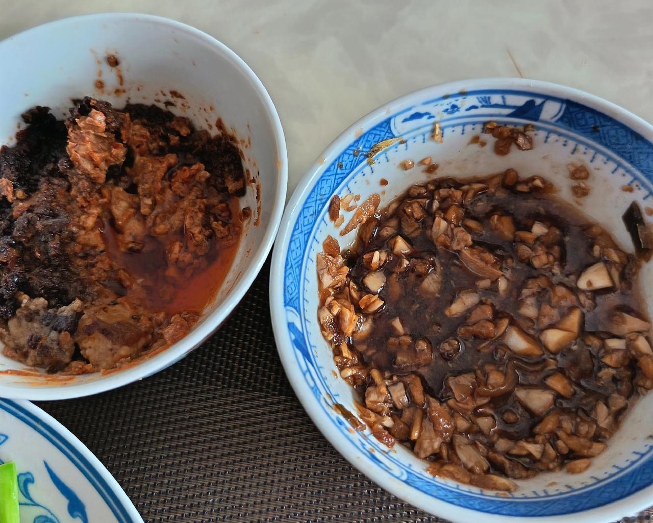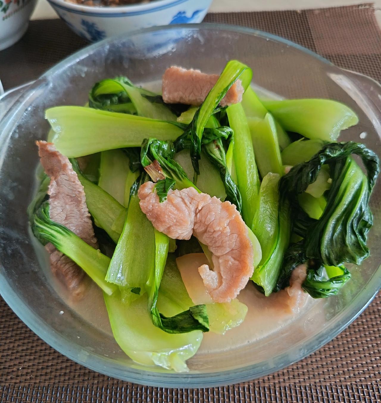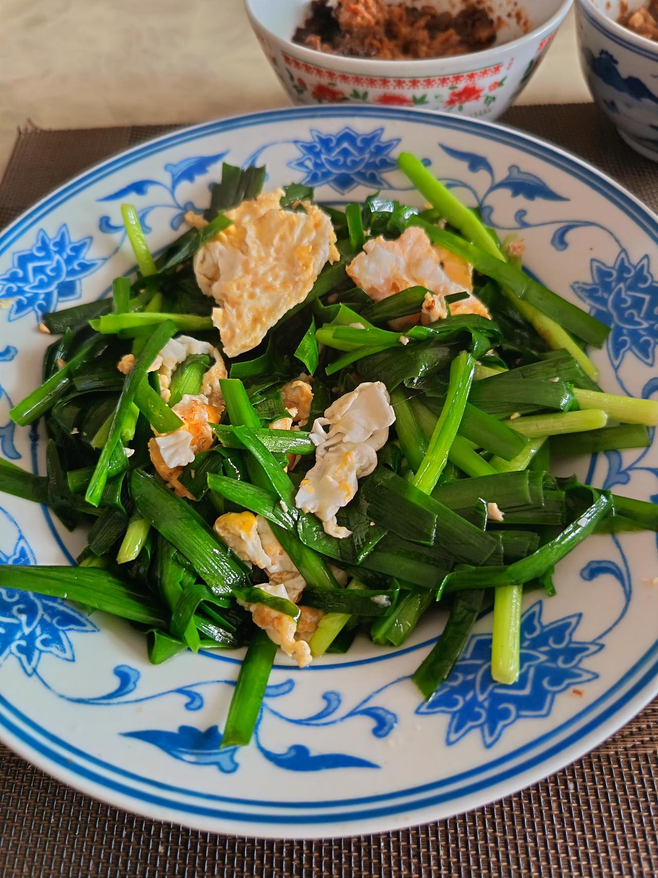 韭菜炒鸡蛋、青菜炒瘦猪肉,另外呢,这么清淡的菜没有味道,有两个开胃的: