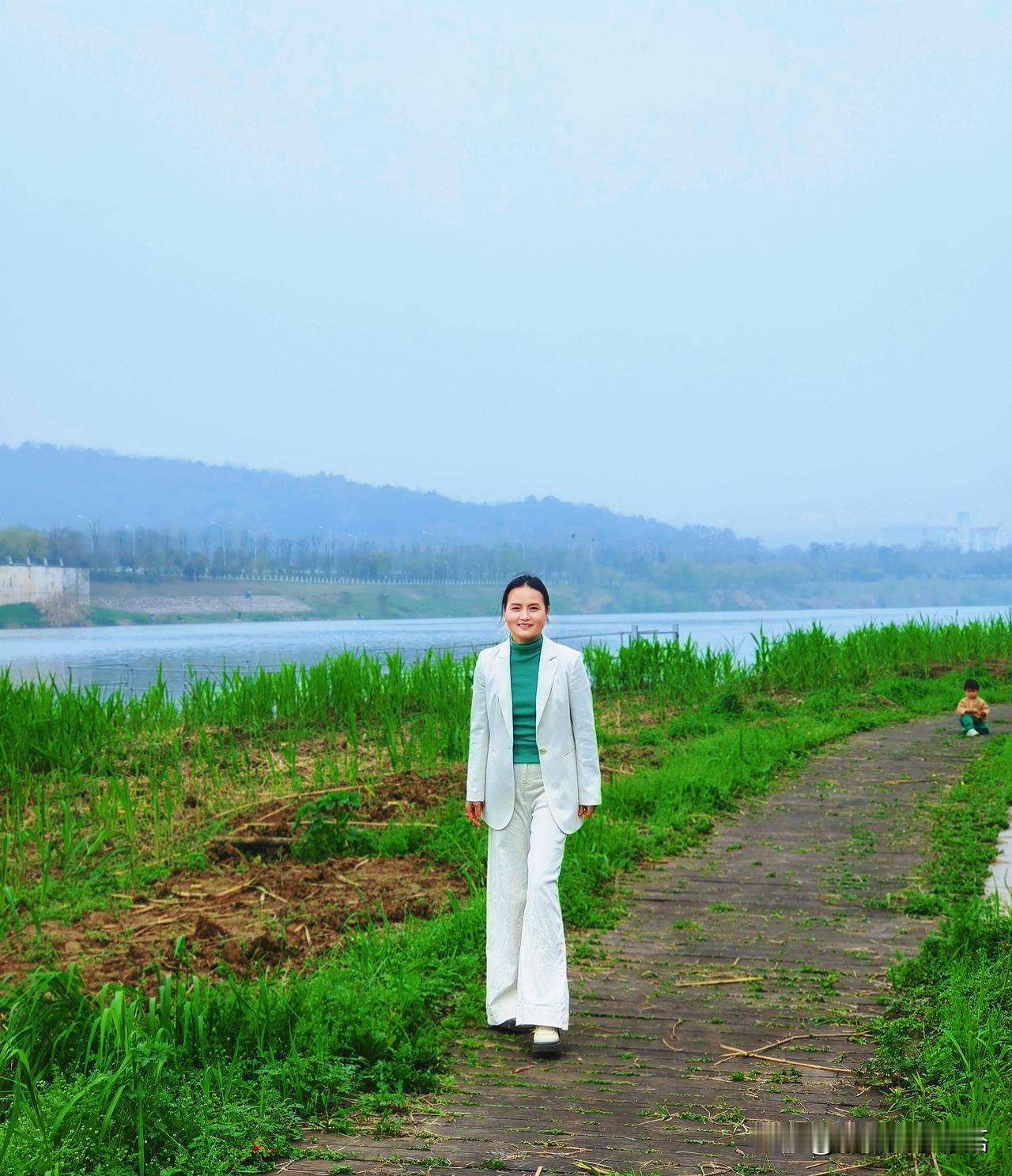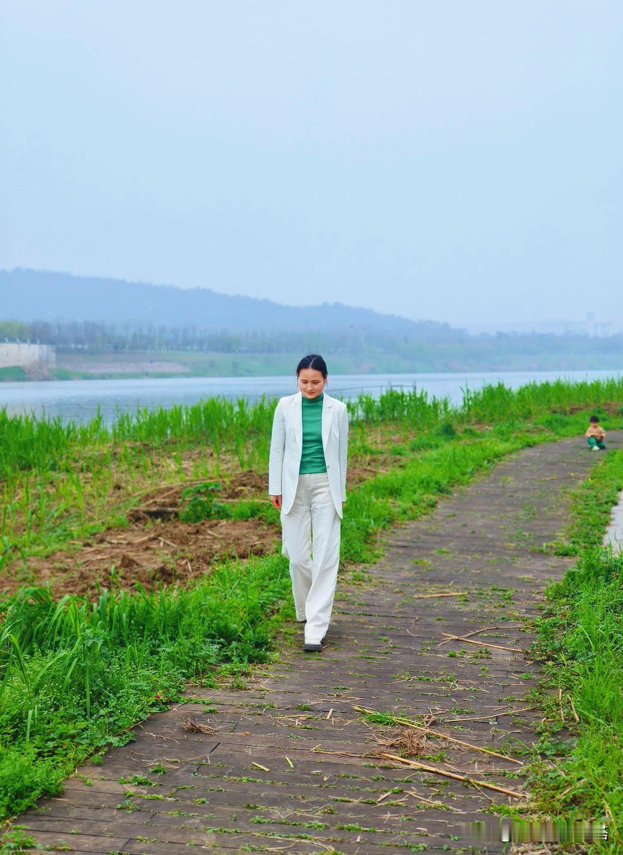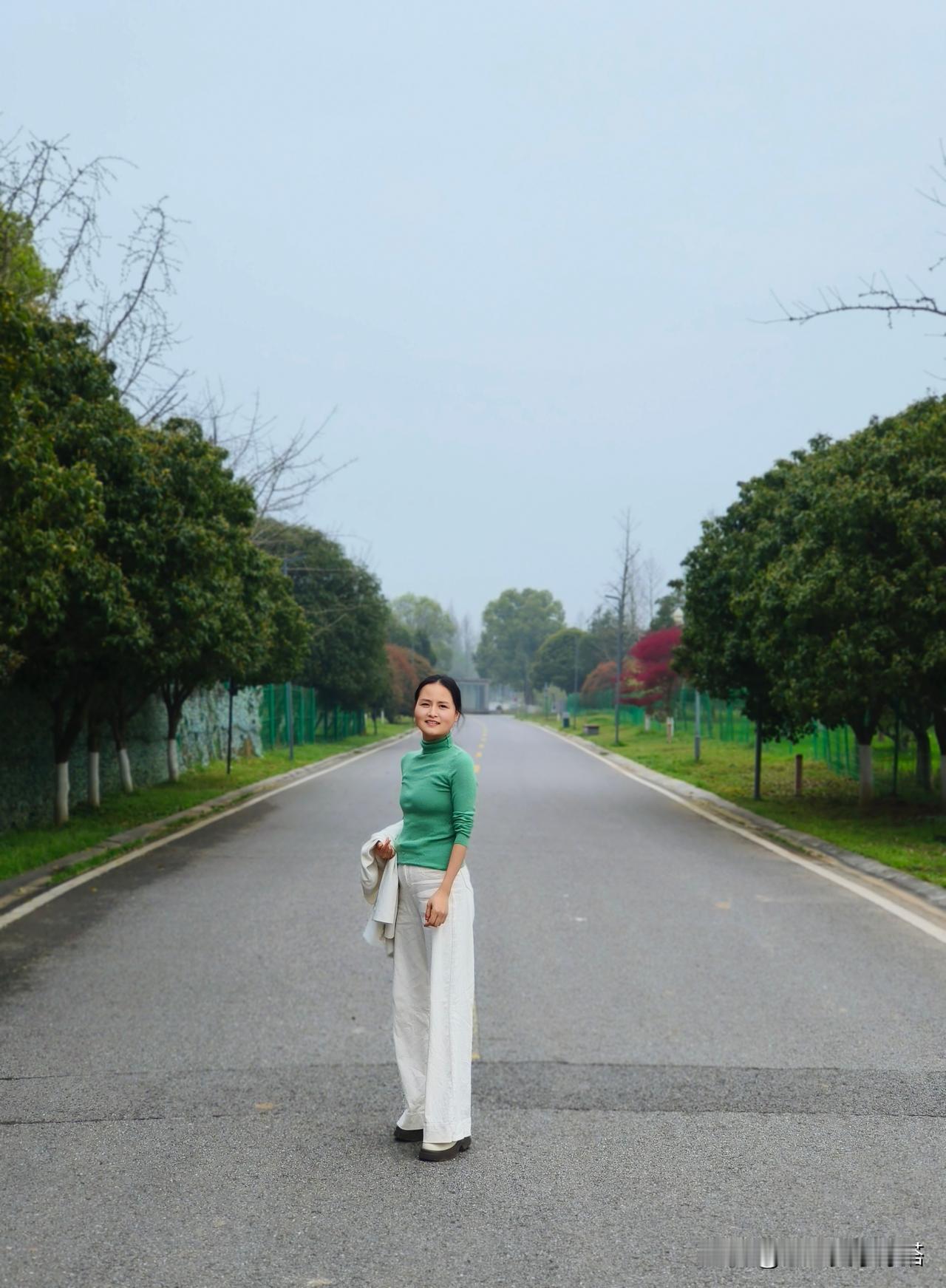 三月踏青,用白西装+白牛仔裤+绿毛衣打造9:1高级感,绿色只做点睛,和春色完美呼应。