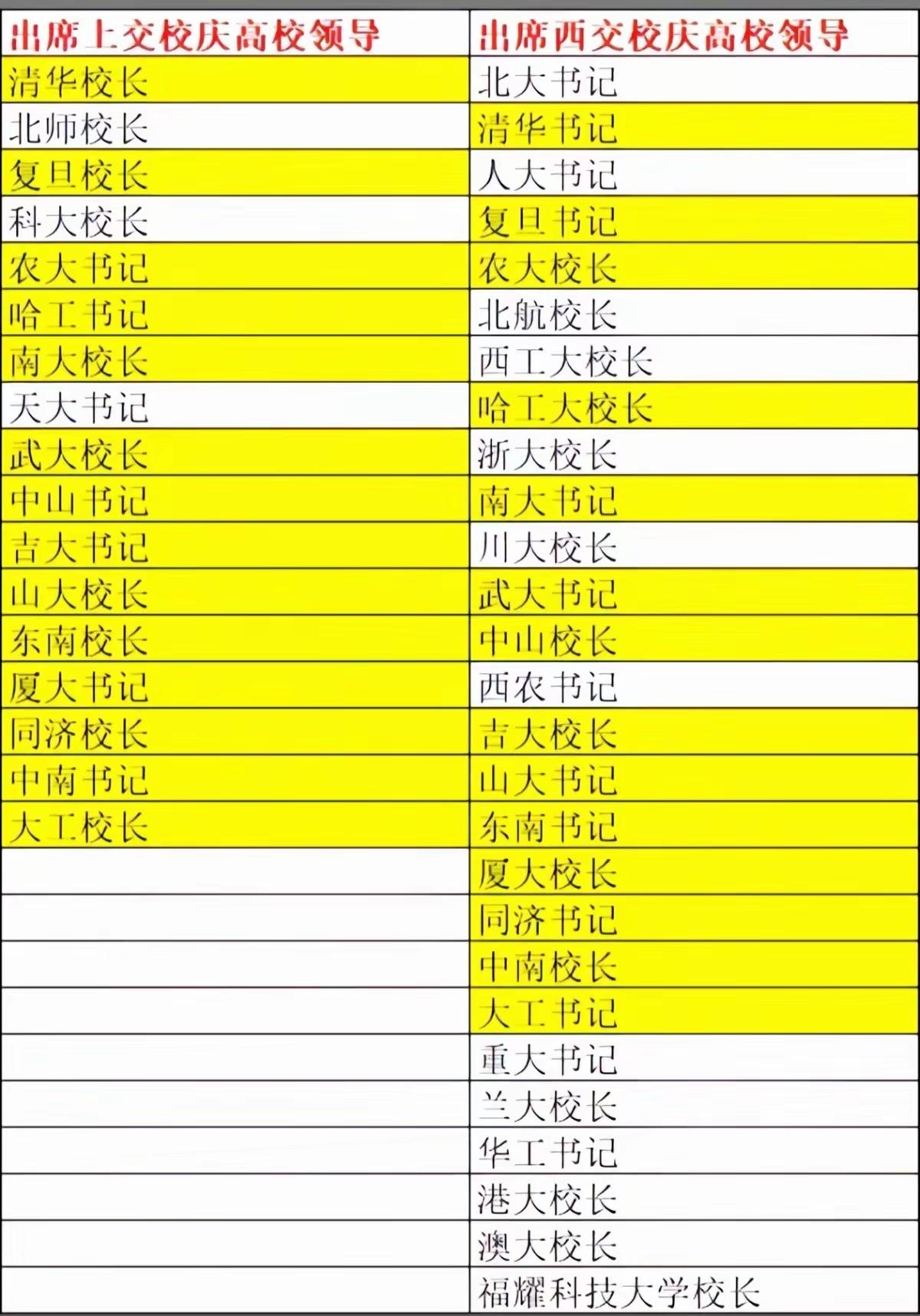 西交校庆直接迎来一众高校书记坐镇,北大书记、清华书记、人大书记、南大书记、复旦书记,高校一把手数量明显多于上交大。