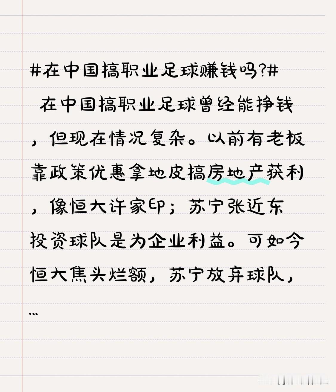 在中国搞职业足球赚钱吗? 在中国搞职业足球曾经能挣钱,但现在情况复杂。以前有老板