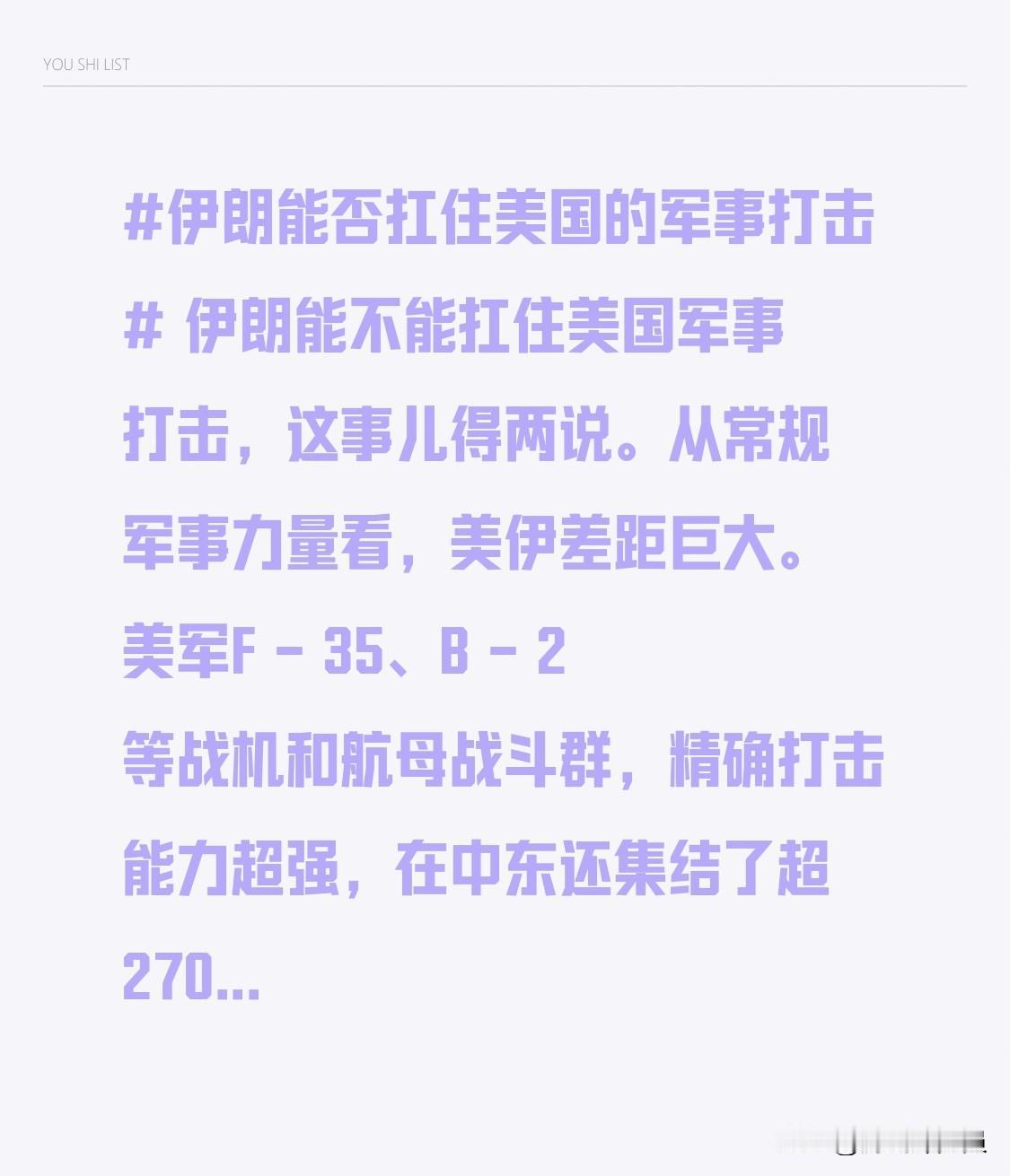 伊朗能不能扛住美国军事打击,这事儿得两说。从常规军事力量看,美伊差距巨大。美军F - 35、B - 2等战机和航母战斗群,精确打击能力超强,在中东还集结了超270架战机,每天能执行约800架次空袭。