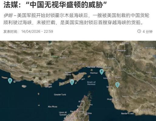 法媒表示,毫无疑问,中国无视了华盛顿的威胁!在中国油轮 “富星” 号驶过霍尔木兹海峡后,4 月 15 日法新社发文表示,在美国军舰对霍尔木兹海峡实施封锁后,一艘被美国列入制裁名单的中国货轮顺利通行海峡,并未遭到拦截,这也是美国启动封锁后首艘穿越该海峡的货船。与此同时,其他国家另有六艘油轮尝试通过霍尔木兹海峡,却在美军舰艇的封锁下选择了折返。